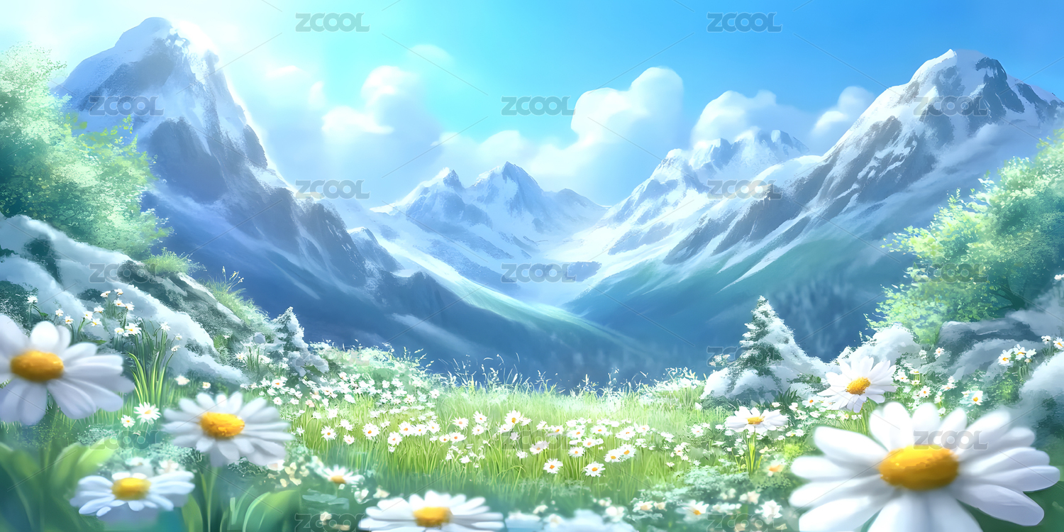 雪山,卡通,动漫,草地,雏菊,山脉,白云,蓝天