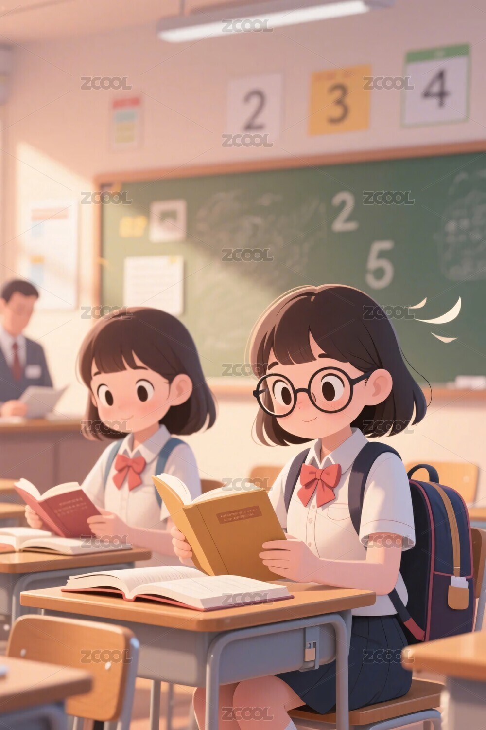 AIGC202402,学校,教室,课桌,明亮,学习,阳光,可爱,女孩,男孩