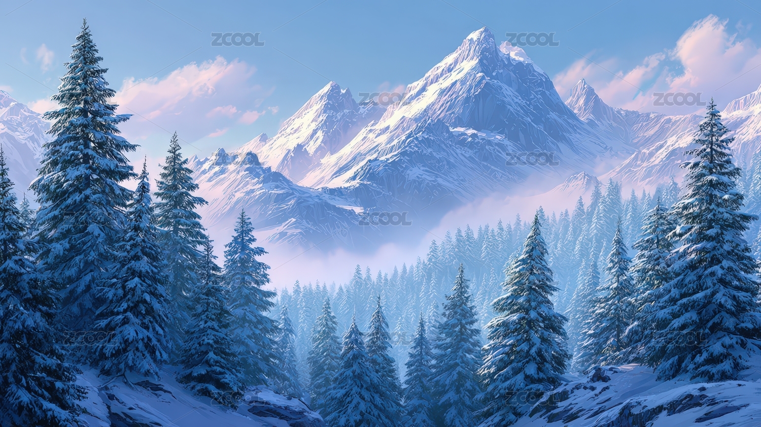 插图,插画,冬天,冬季,雪山,风景,雪,自然美,寒冷,雪花