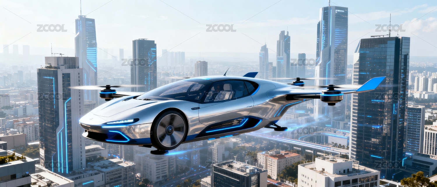科技空中带旋翼的自动驾驶飞行汽车赛博插画