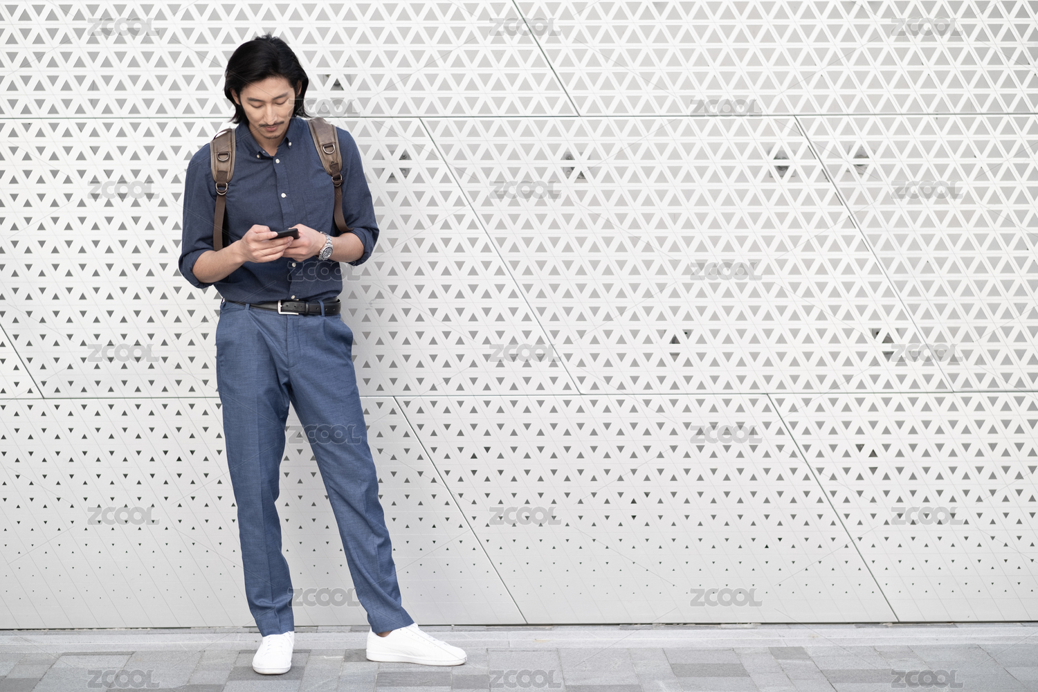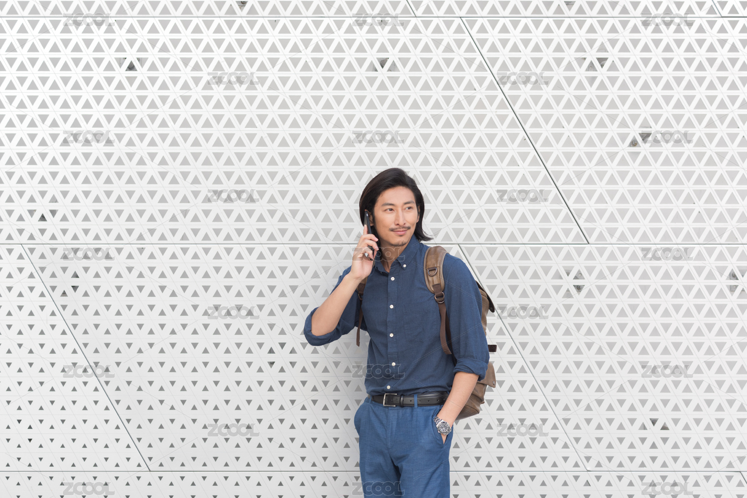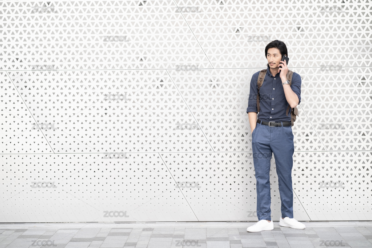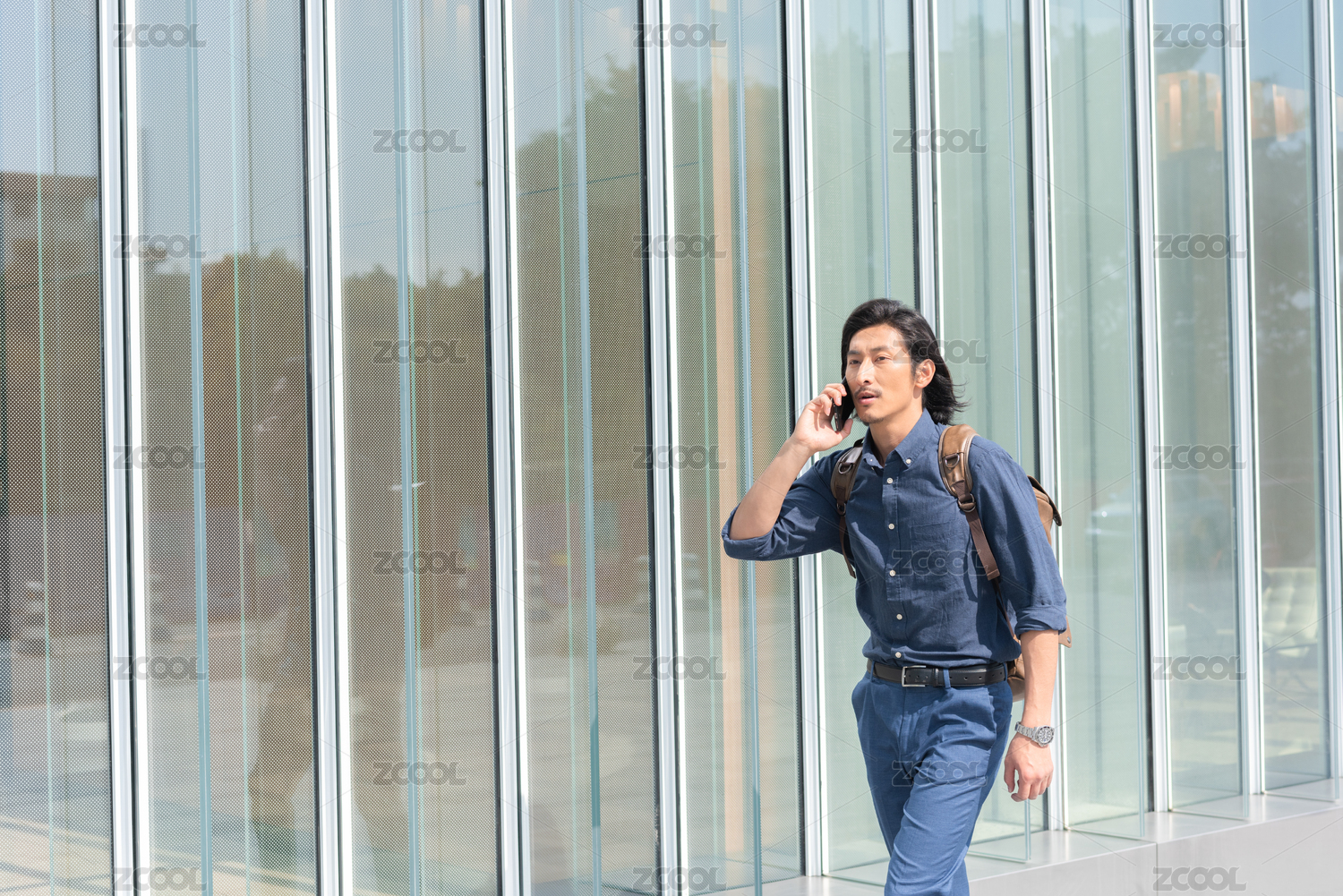亚裔商务男士在写字楼玻璃窗旁使用手机