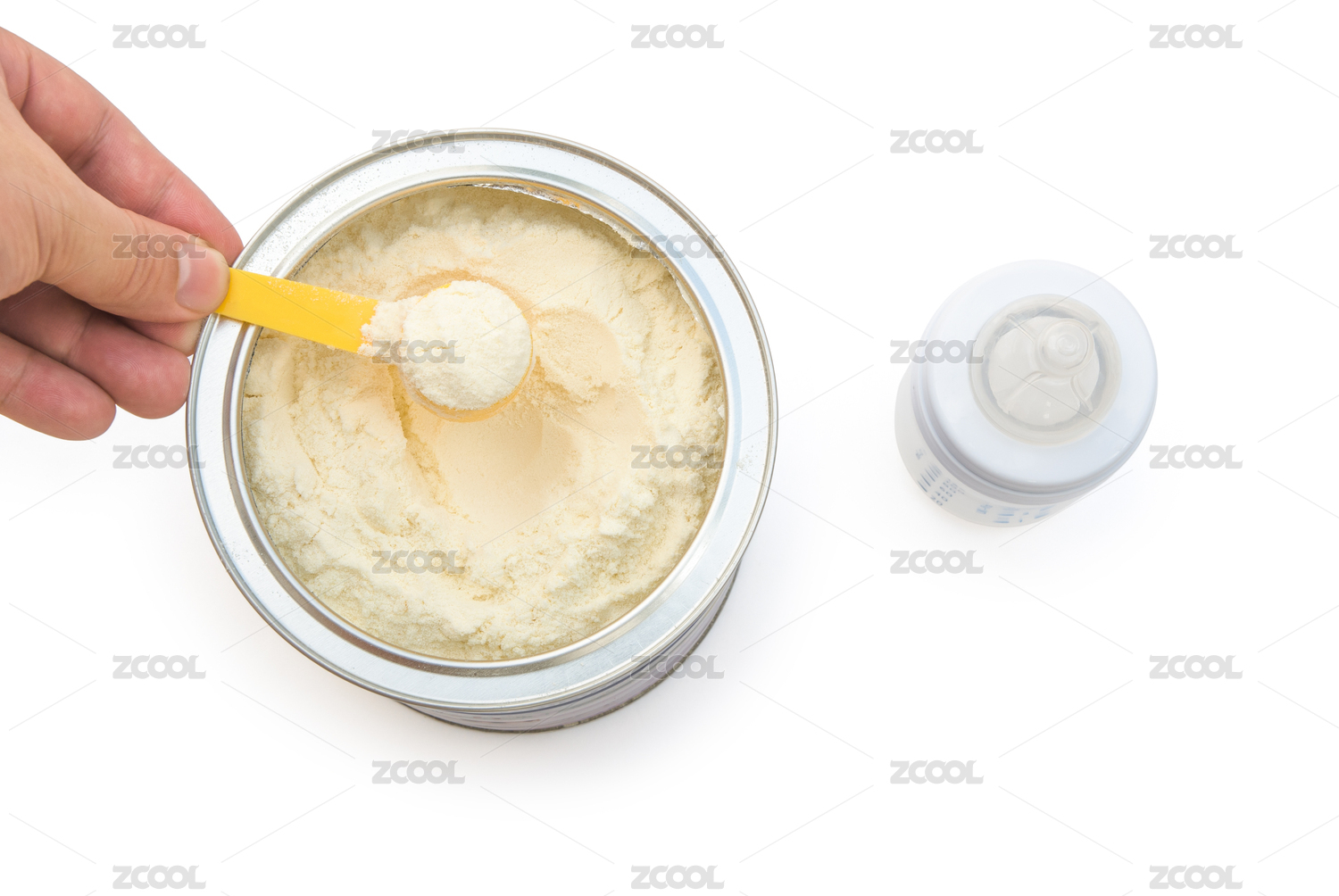 用量勺从奶粉罐中舀取婴儿配方奶粉