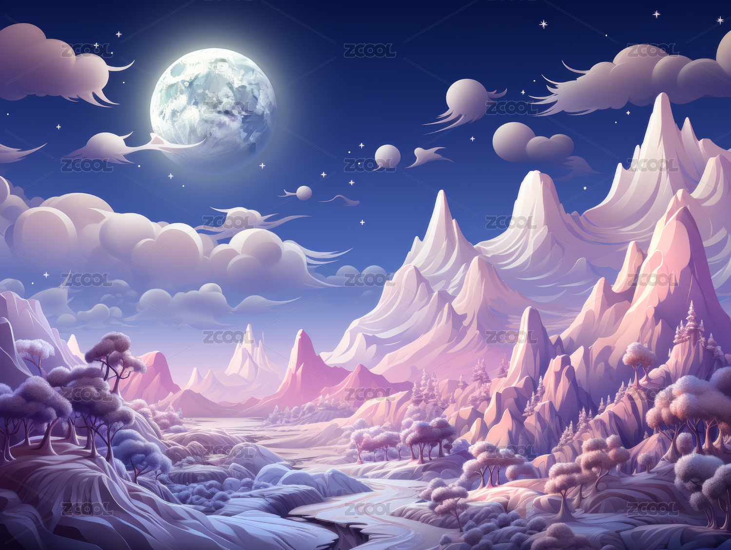 月夜,山峰,紫色,梦幻,3D,几何,抽象,艺术,背景,壁纸