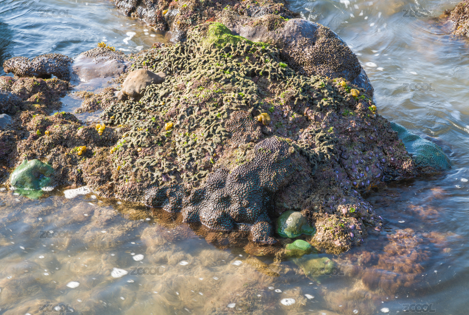 大潮过后裸露在海底礁石上的各类苔藓虫特写