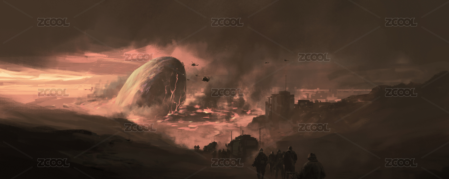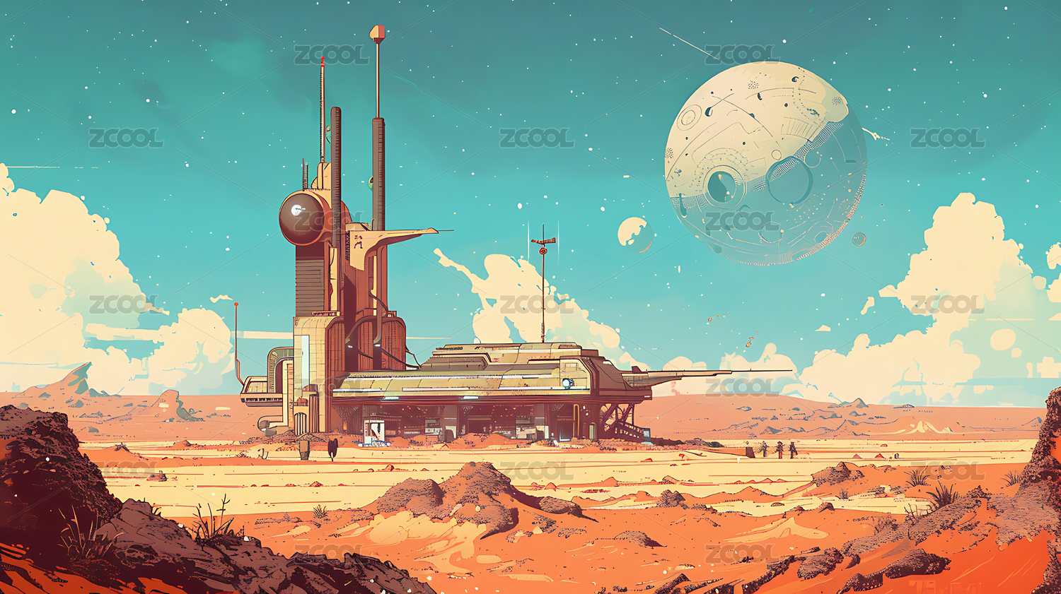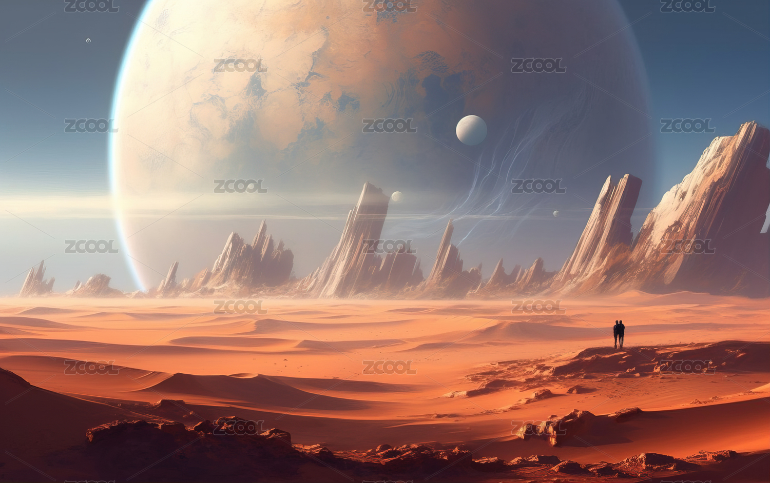外星追踪器在沙漠里追逐人类,数码绘画。