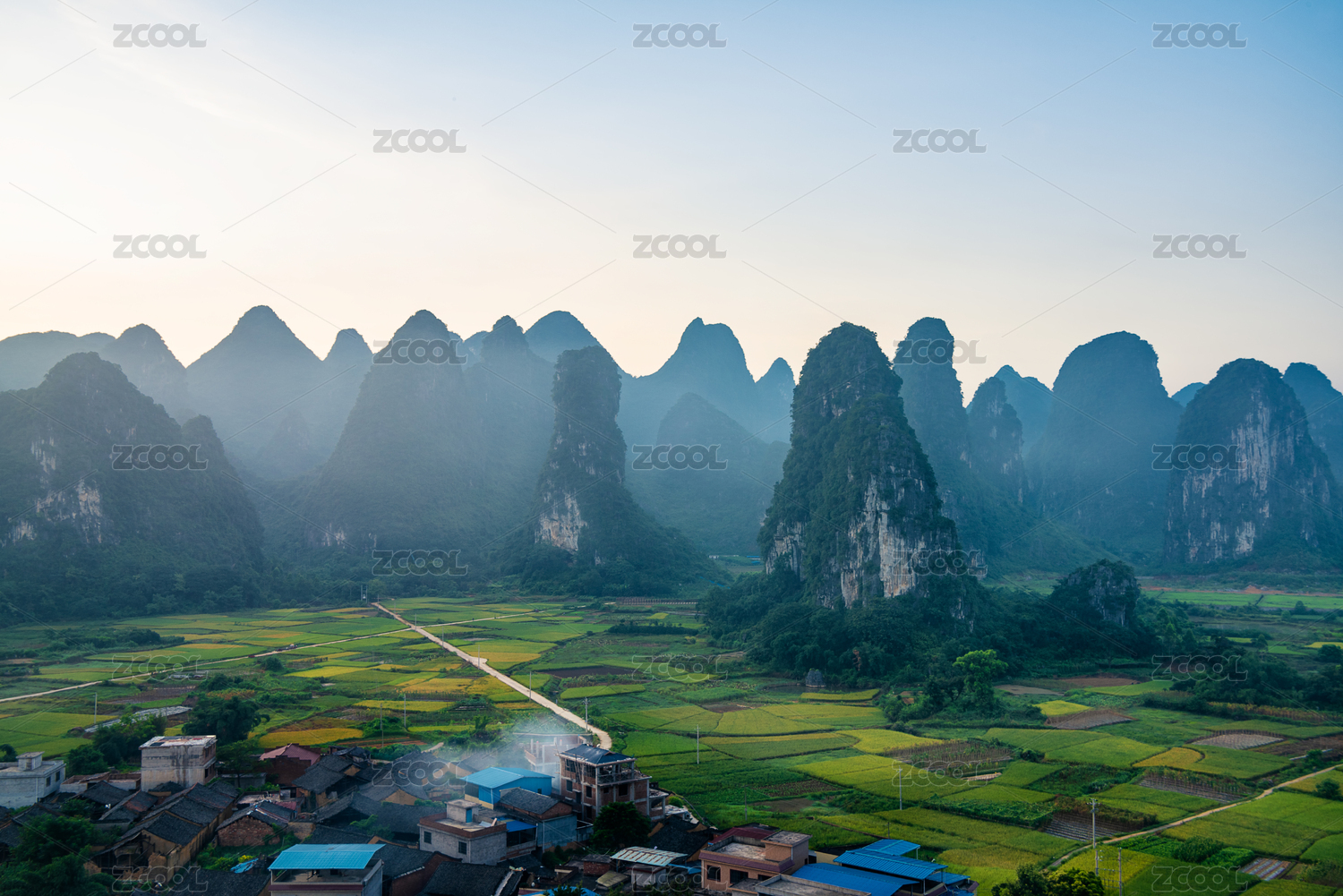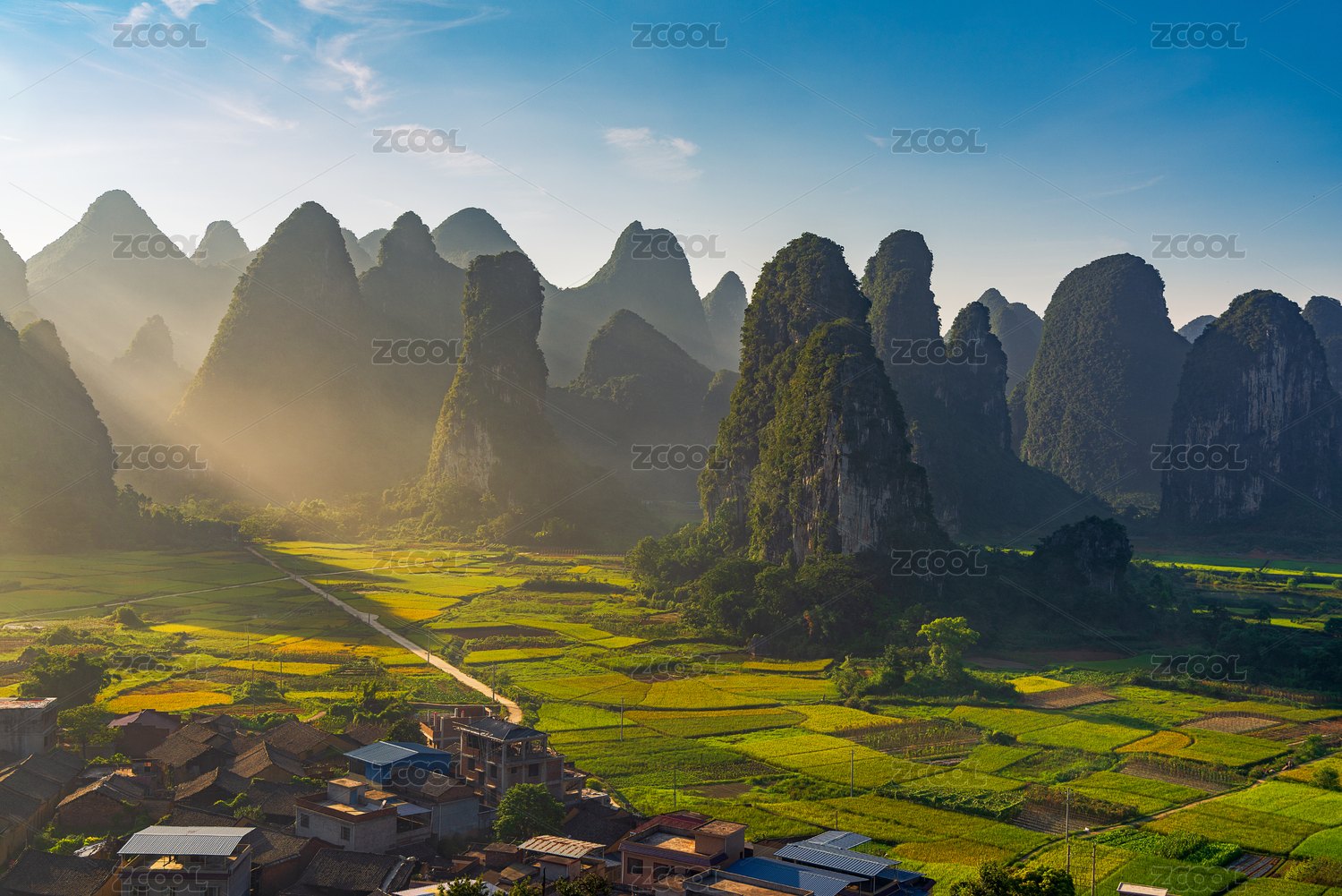 中国广西桂林东山村清晨的田园风光