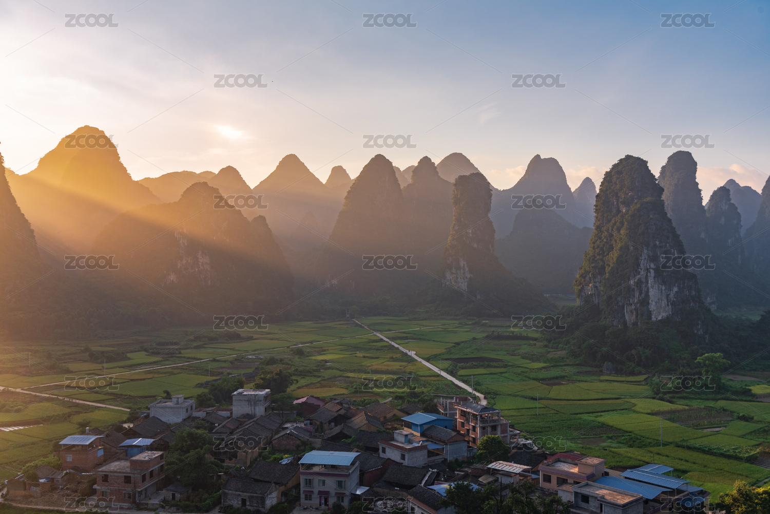 中国广西桂林东山村日出时分的乡村风光