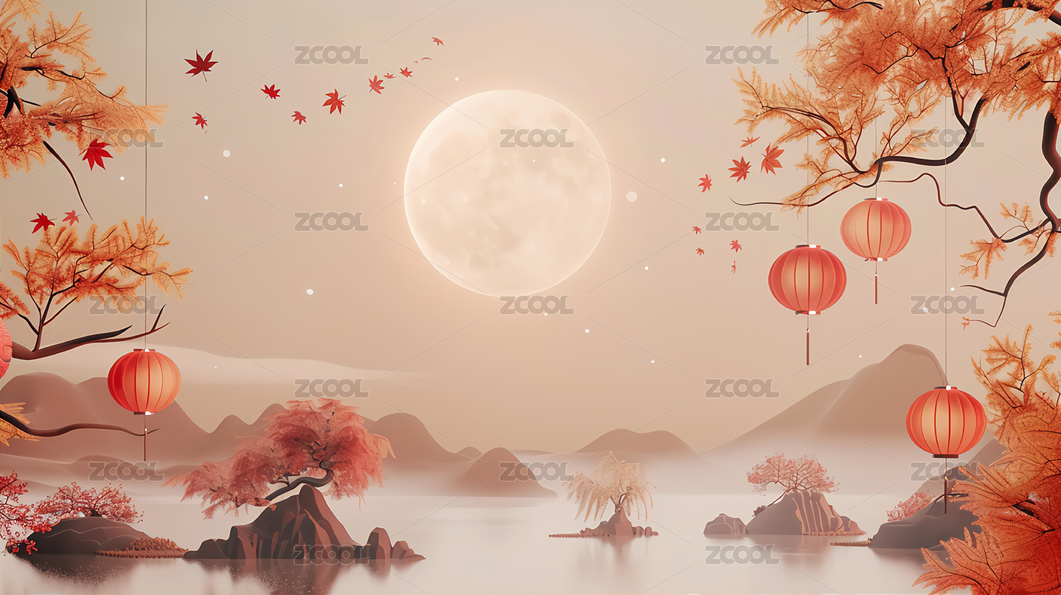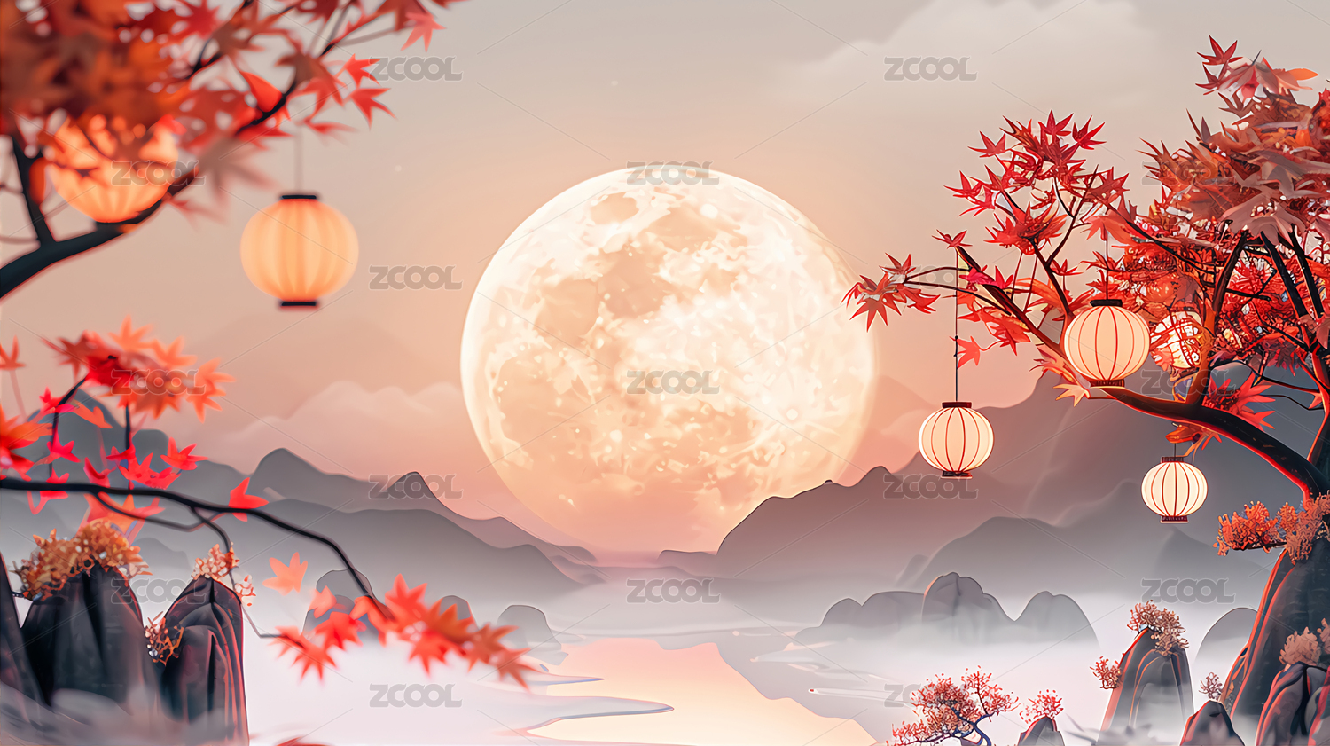国潮,水墨画,山脉,山川,河流,水,倒影,月亮,满月,植物