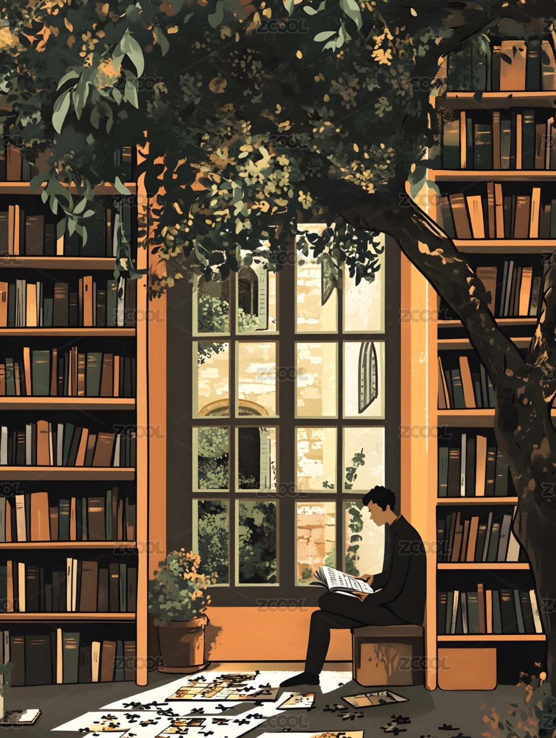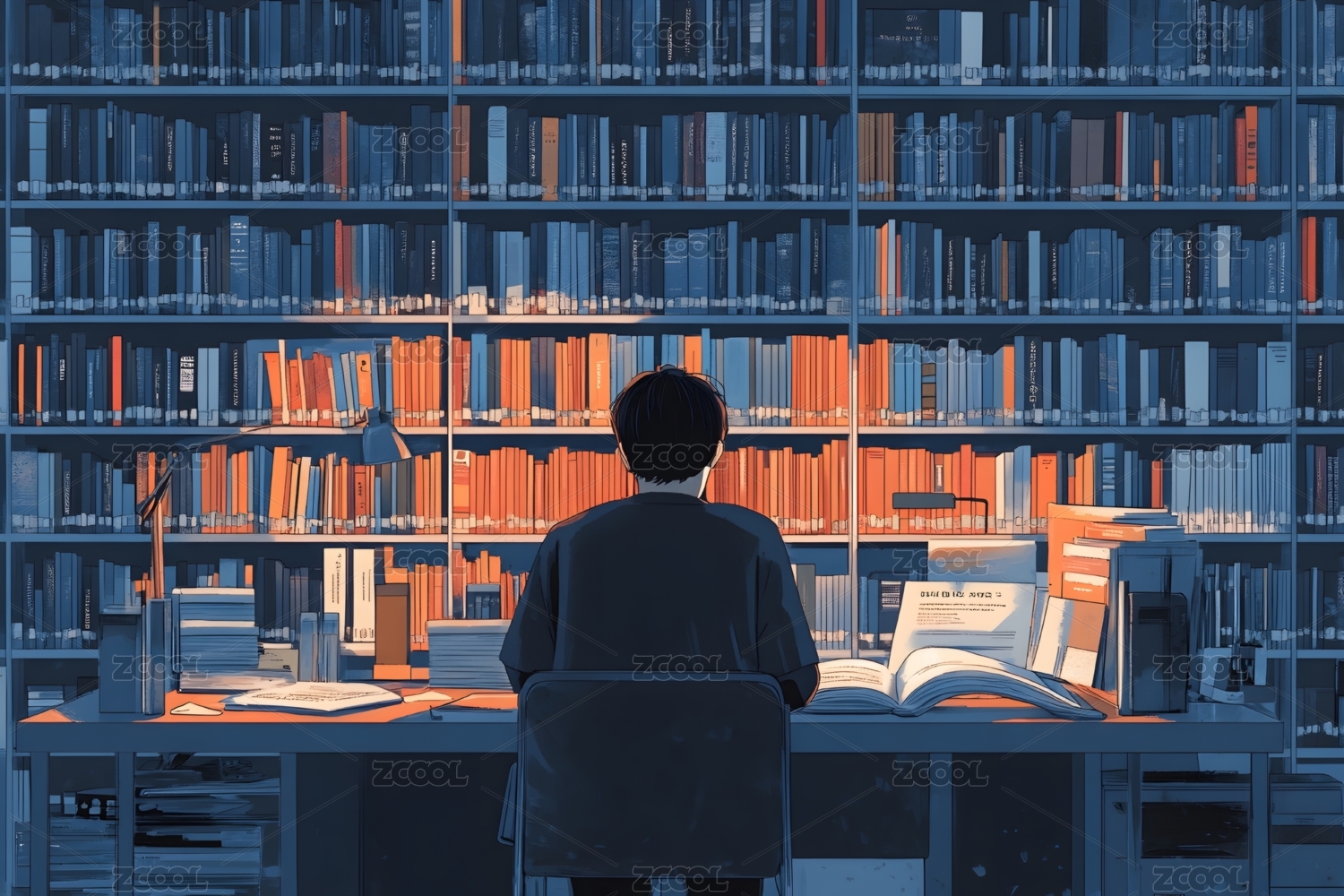 一个男生在图书馆看书的插画
