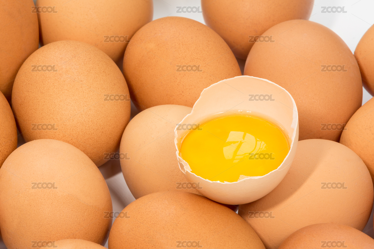 排列整齐的鸡蛋和一枚打开的露出蛋黄的鸡蛋