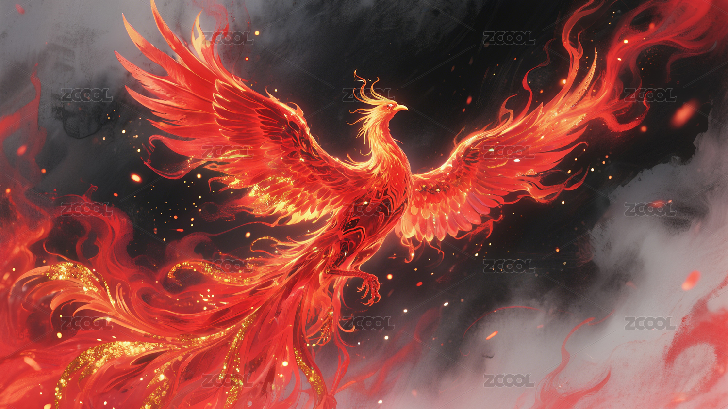 山海经神话传说天空飞翔火凤凰3D立体插画