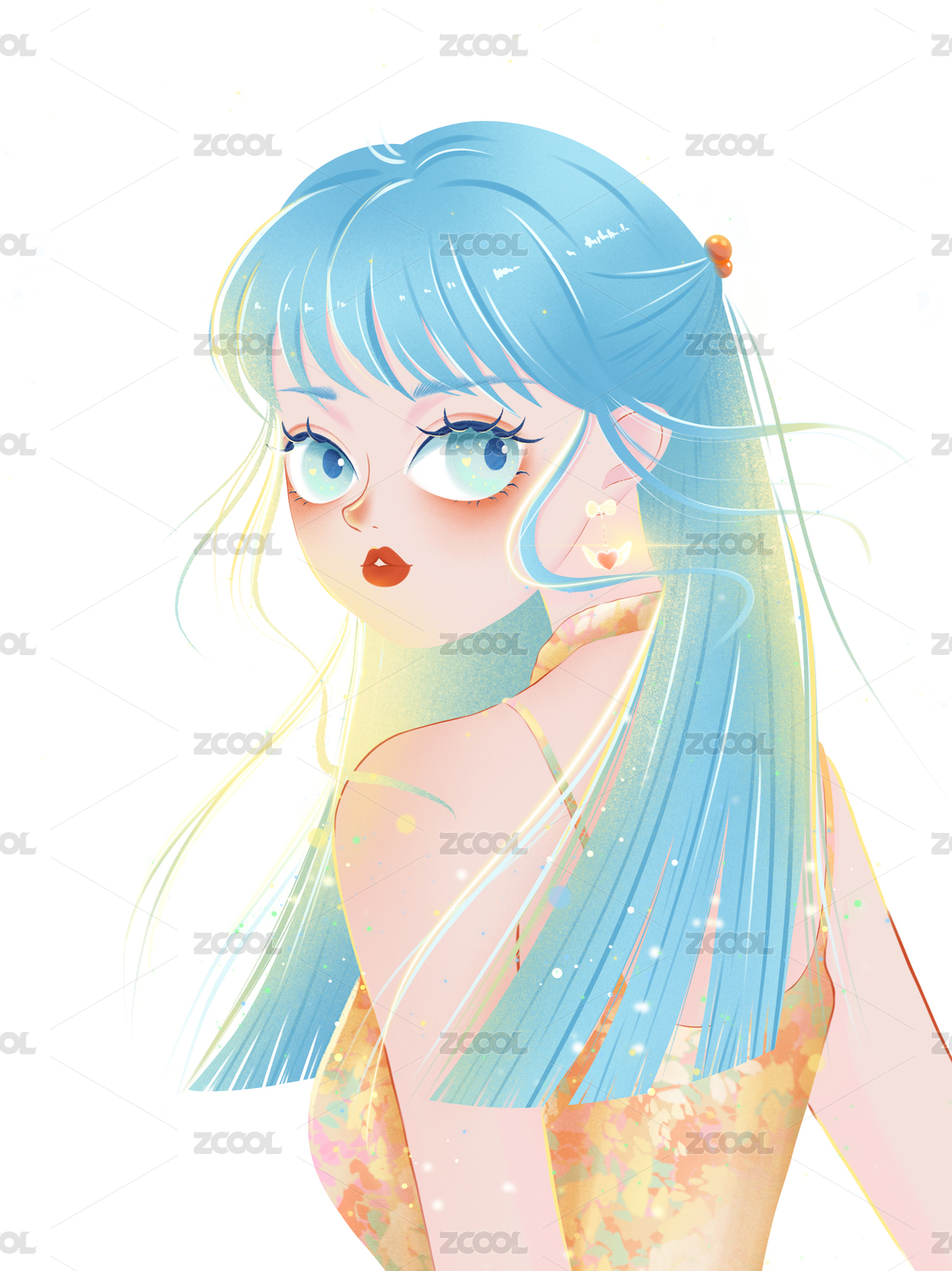 蓝色头发的日系美少女回眸凝视