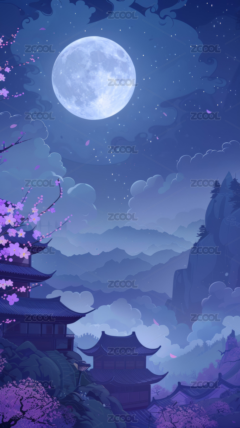 夜晚中式山水插画背景