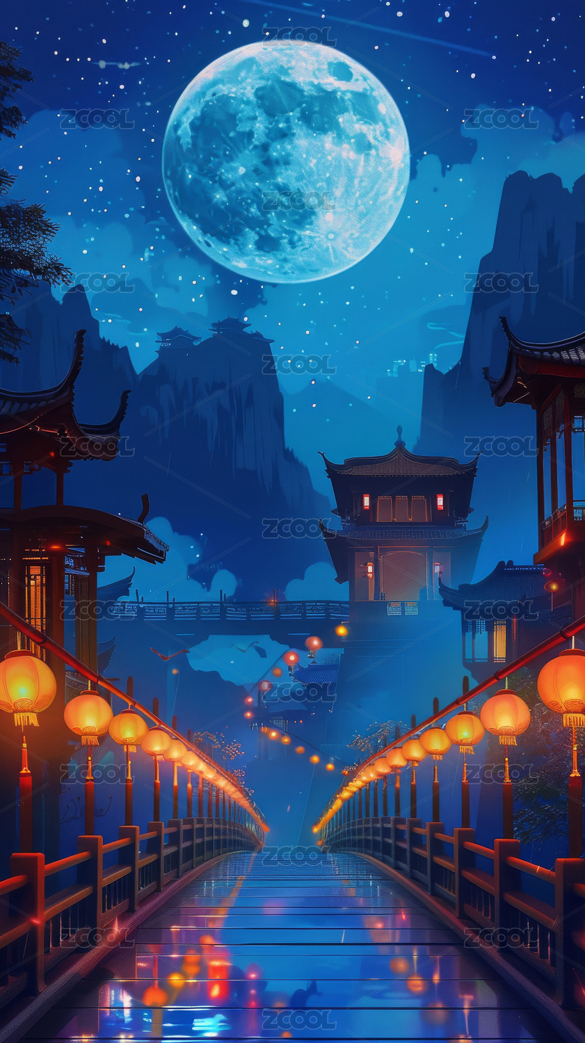 AIGCFG,中式,中国风,国潮风,插画,卡通,月亮,中秋节,山,建筑