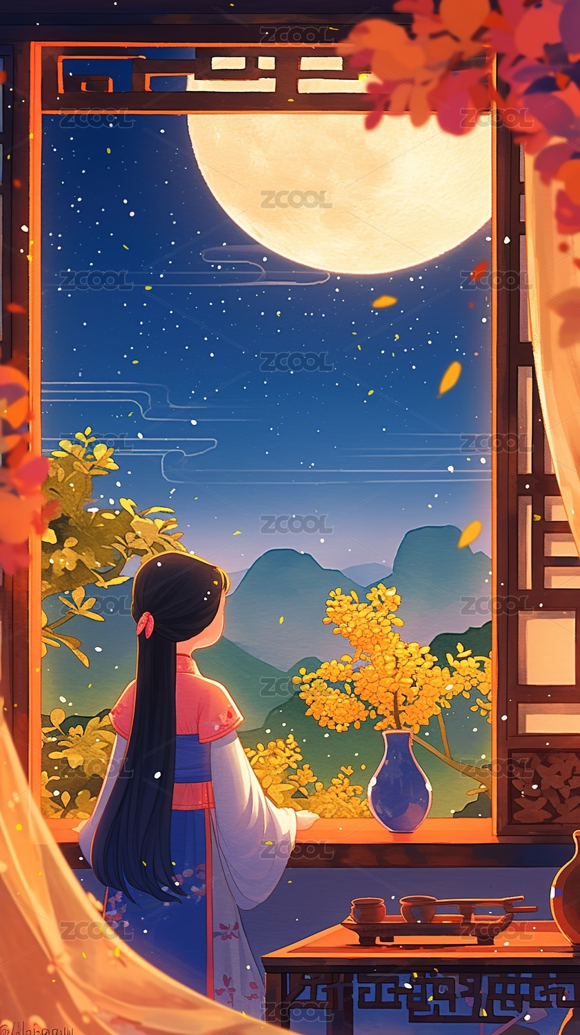 AIGCFG,中式,中国风,国潮风,插画,卡通,中秋节,月亮,风景
