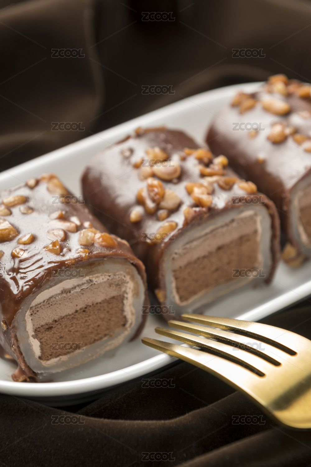 巧克力瑞士卷蛋糕摆放在桌面上特写