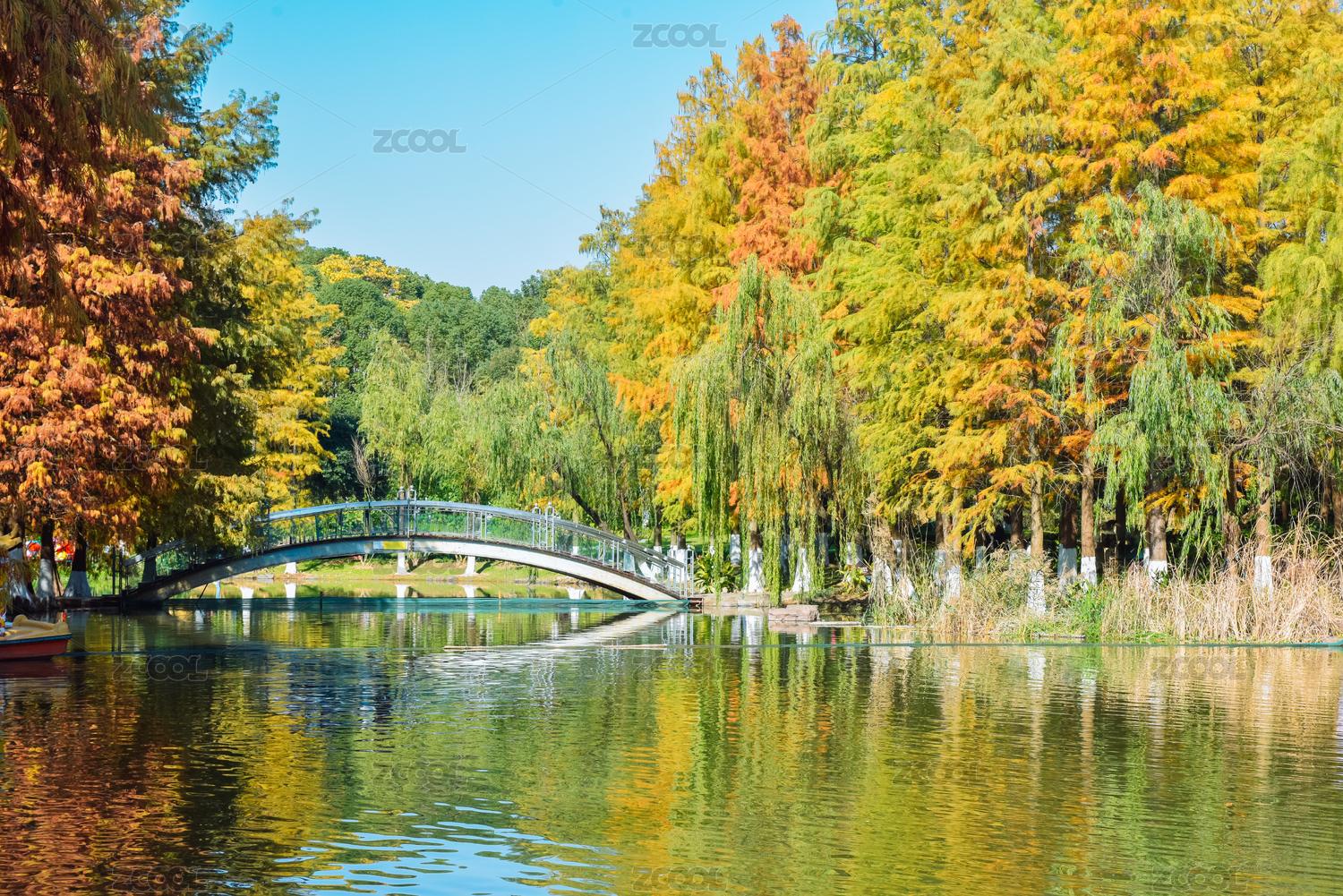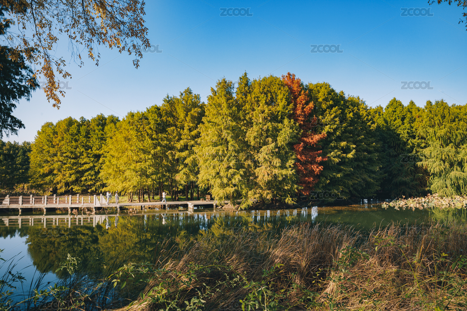 浙江杭州萧山区湘湖畔色彩斑斓的秋林