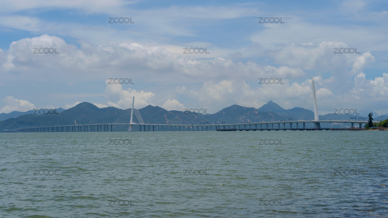 晴天蓝色的深圳湾天空和浅蓝色的海面