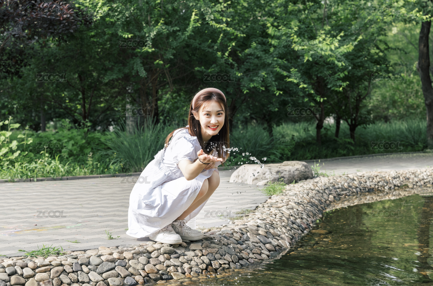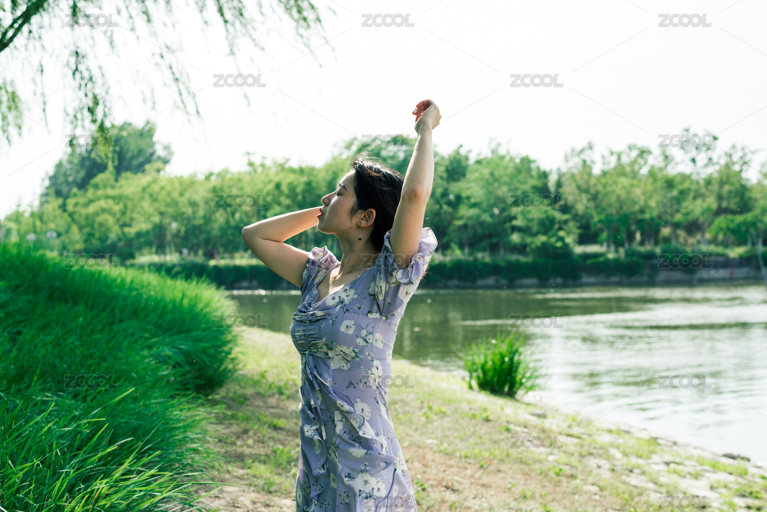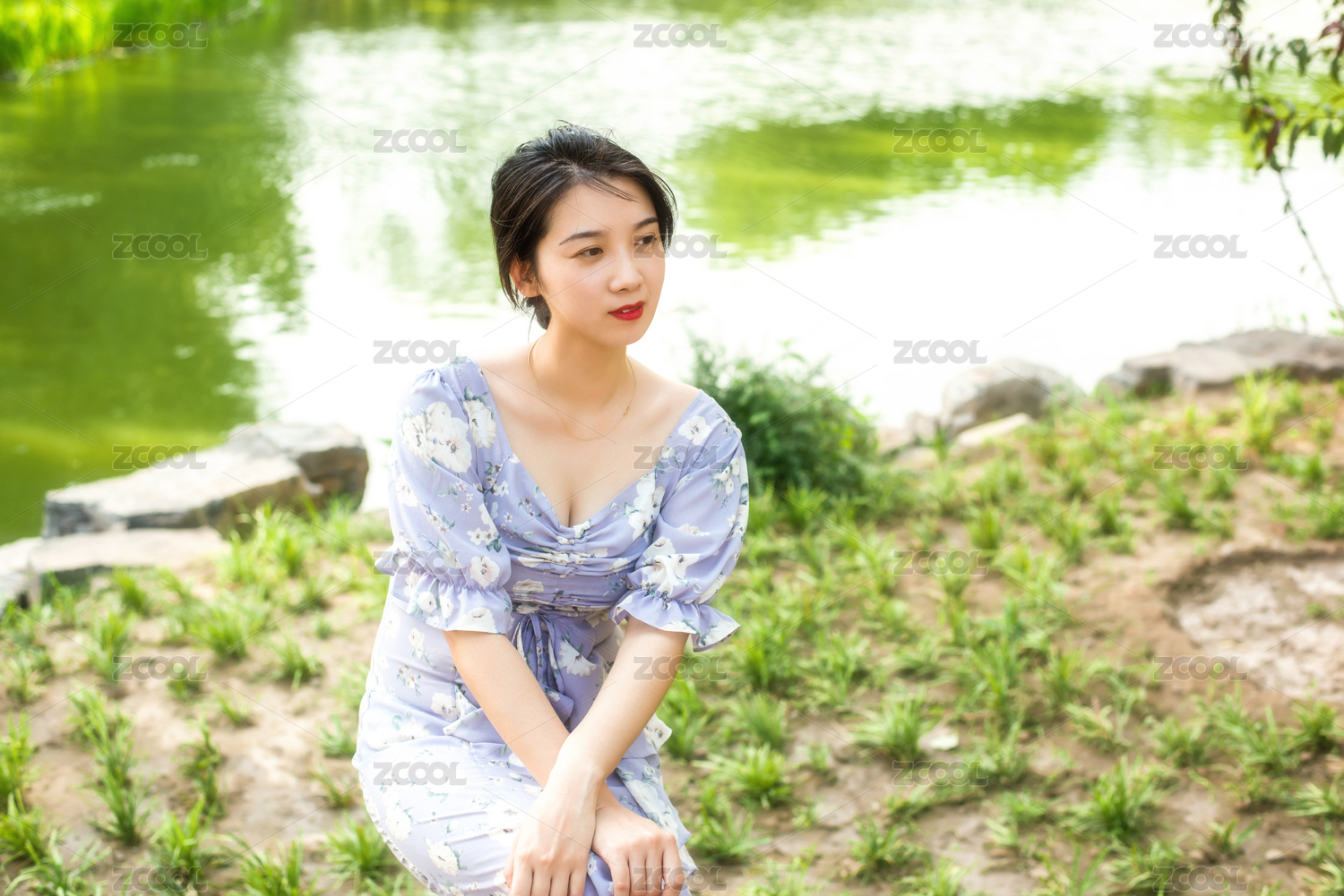 美丽优雅的亚洲女性穿着连衣裙坐在河边