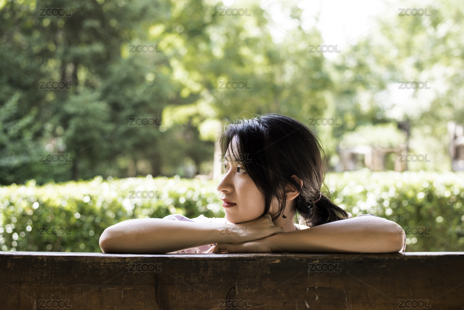 夏天穿职业装坐在公园长椅上的东方女性肖像