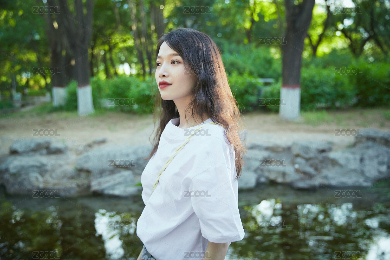 美丽优雅的亚洲女性坐在草地上,夏日午后的花园里,中国古典花园