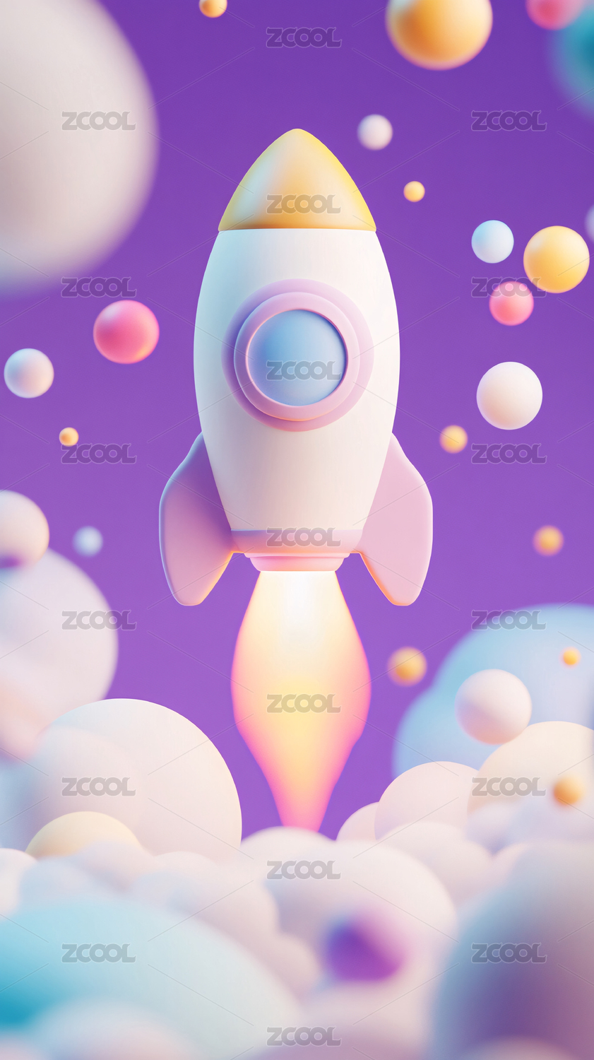 粉色蓝色背景下的卡通火箭