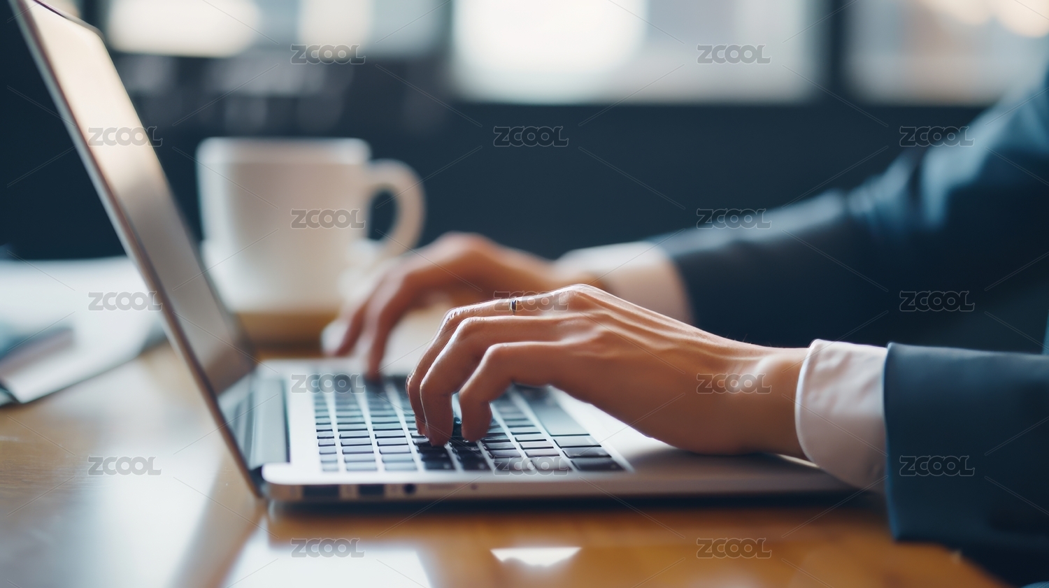 特写白领女性在窗边办公台上的笔记本电脑打字输入