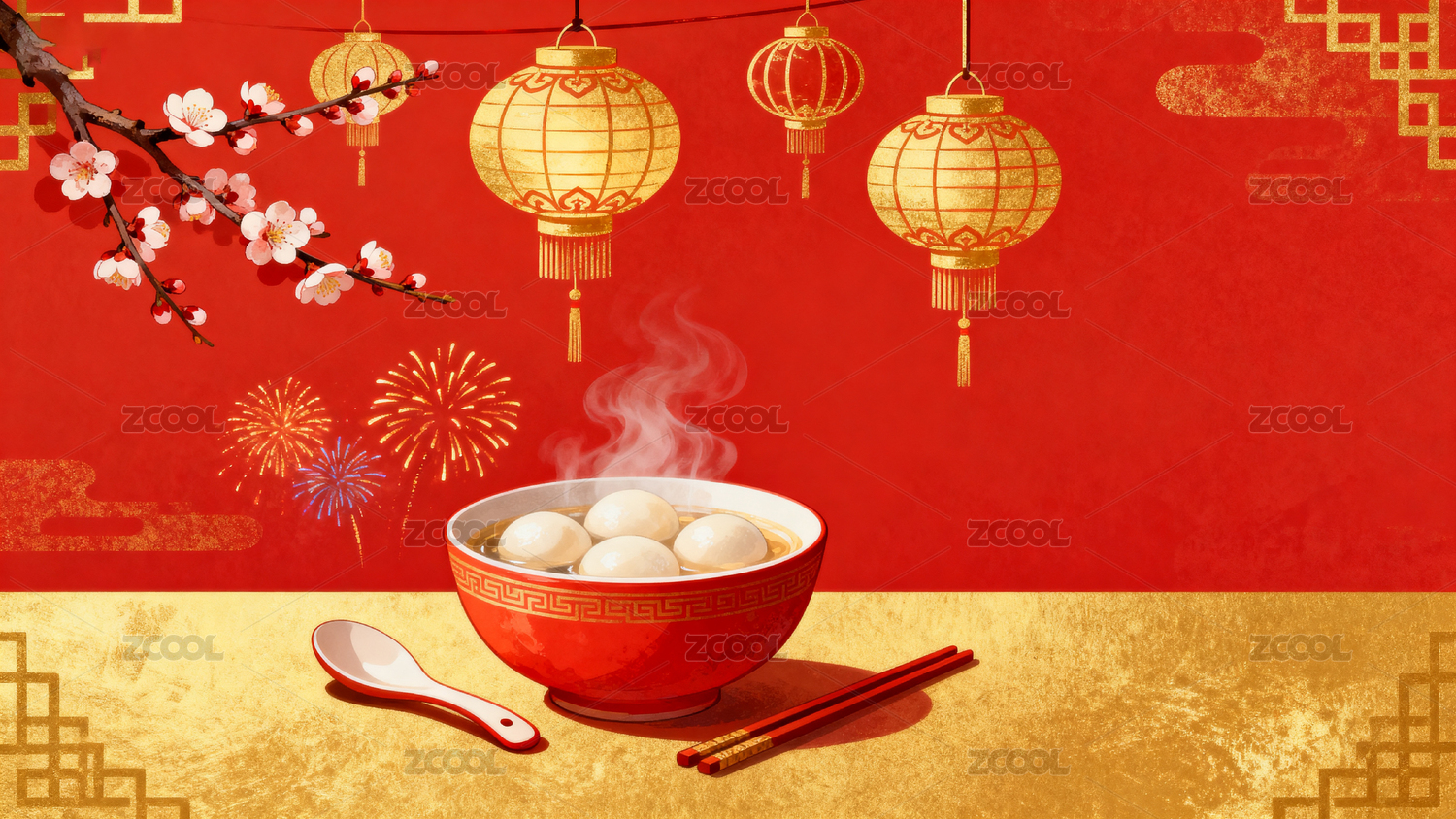 元宵佳节一碗汤圆和灯笼猜灯谜等国潮风插画