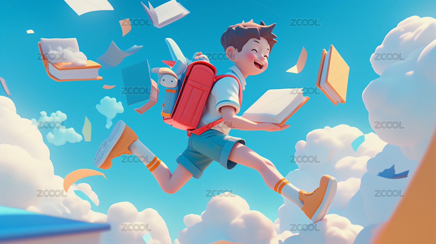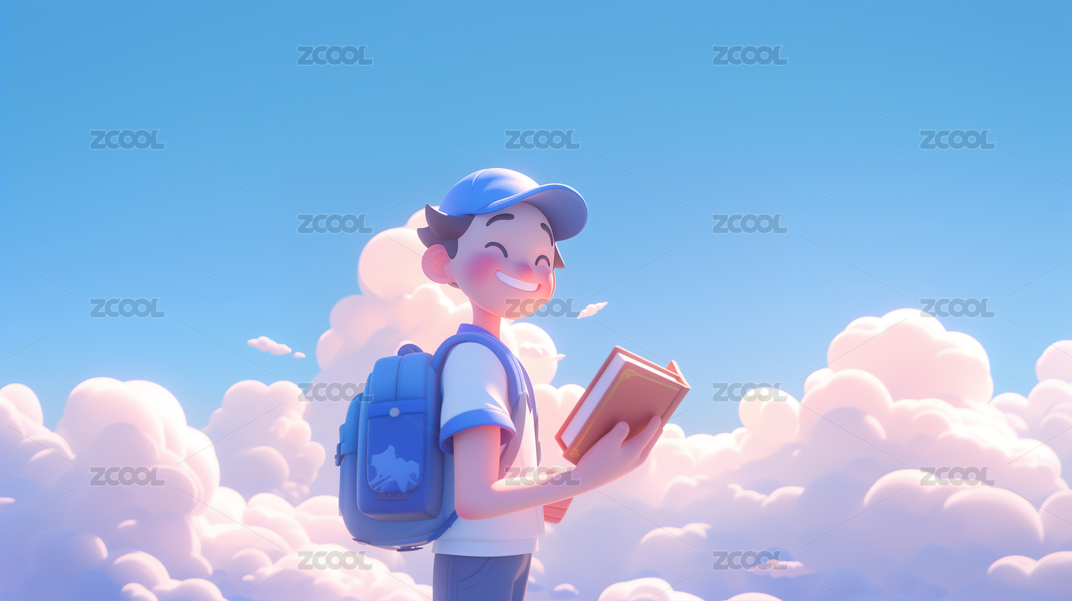 AIGC202402,3D,男孩,学生,蓝天,白云,书包,书籍,阳光,微笑