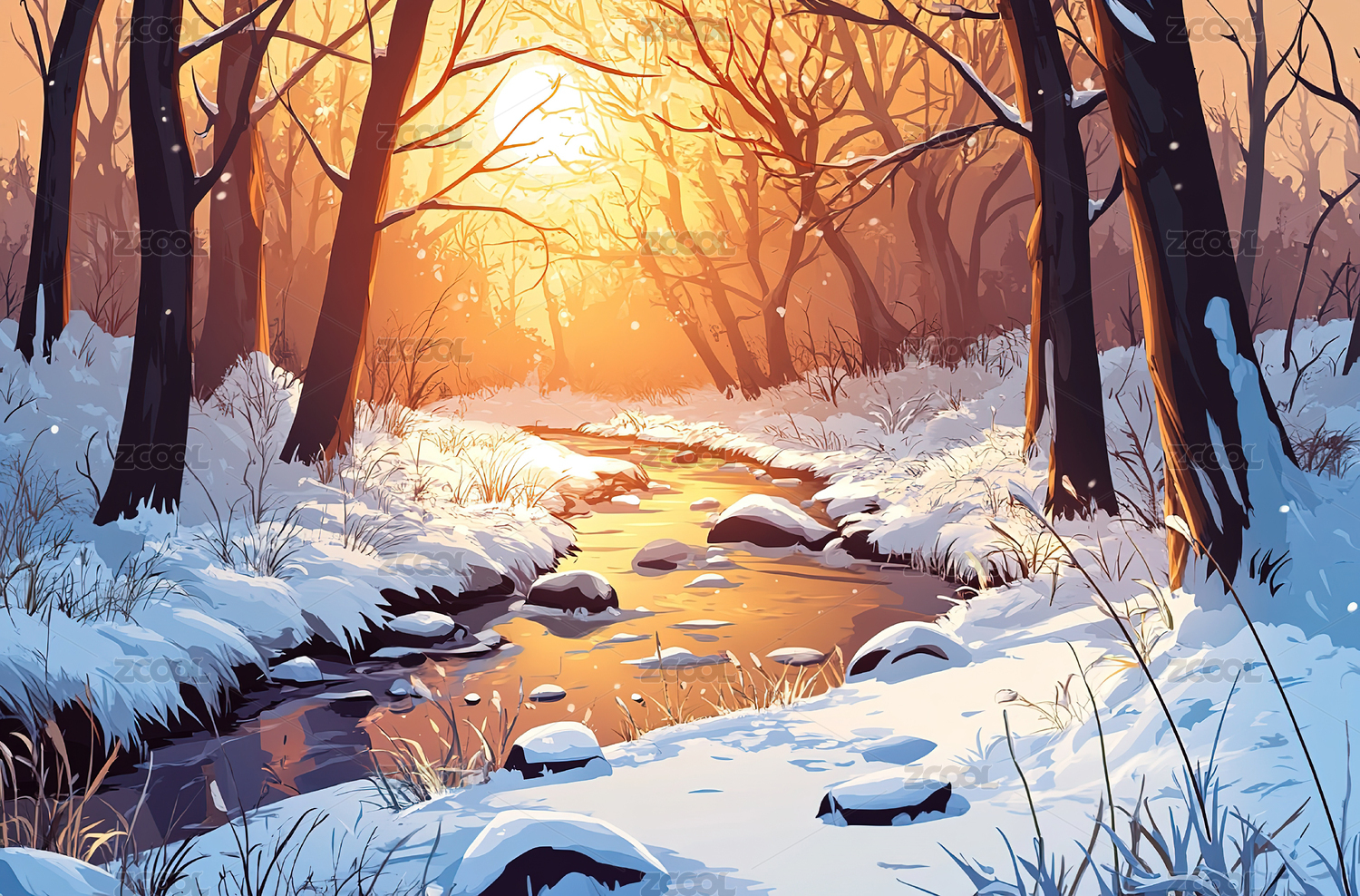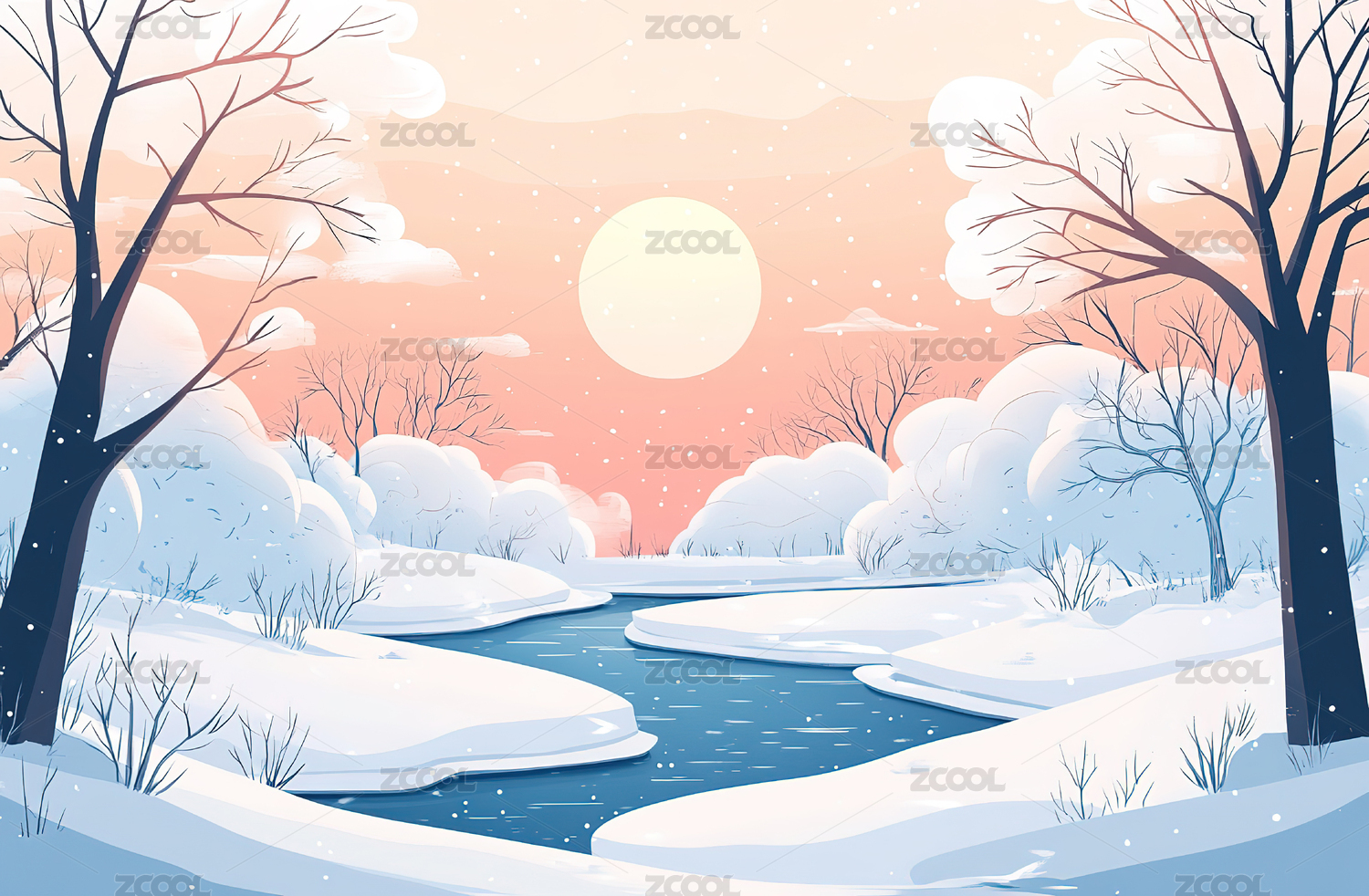 冬季大雪节气插画,雪景中的冬天河流场景插