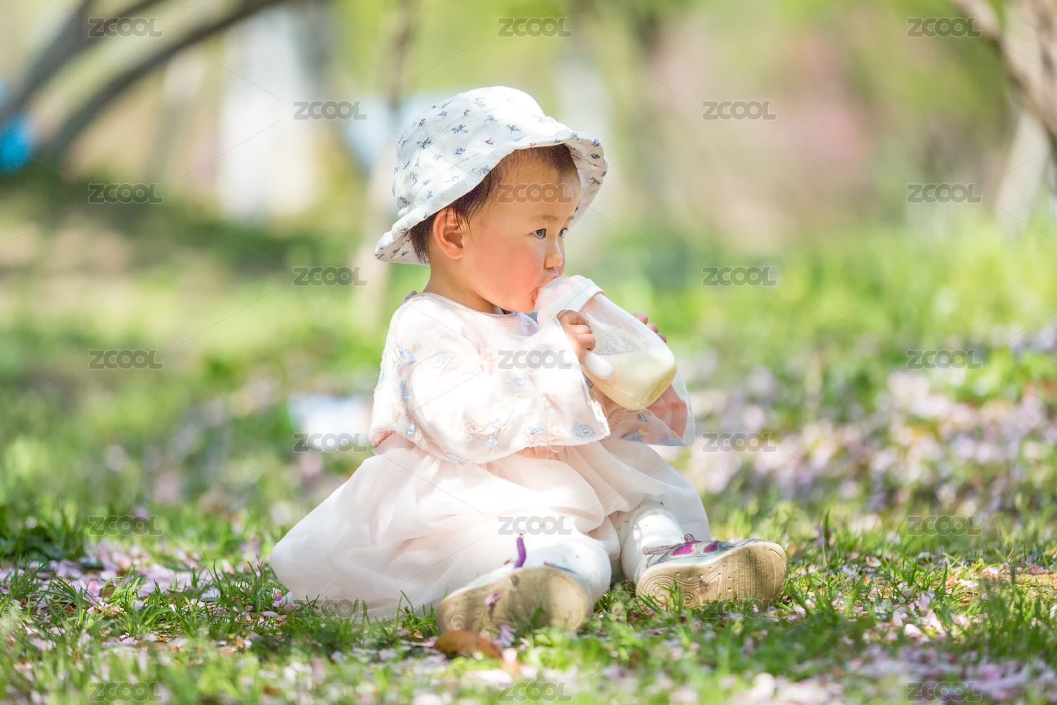 夏天坐在公园草地中看向远处的一岁中国儿童
