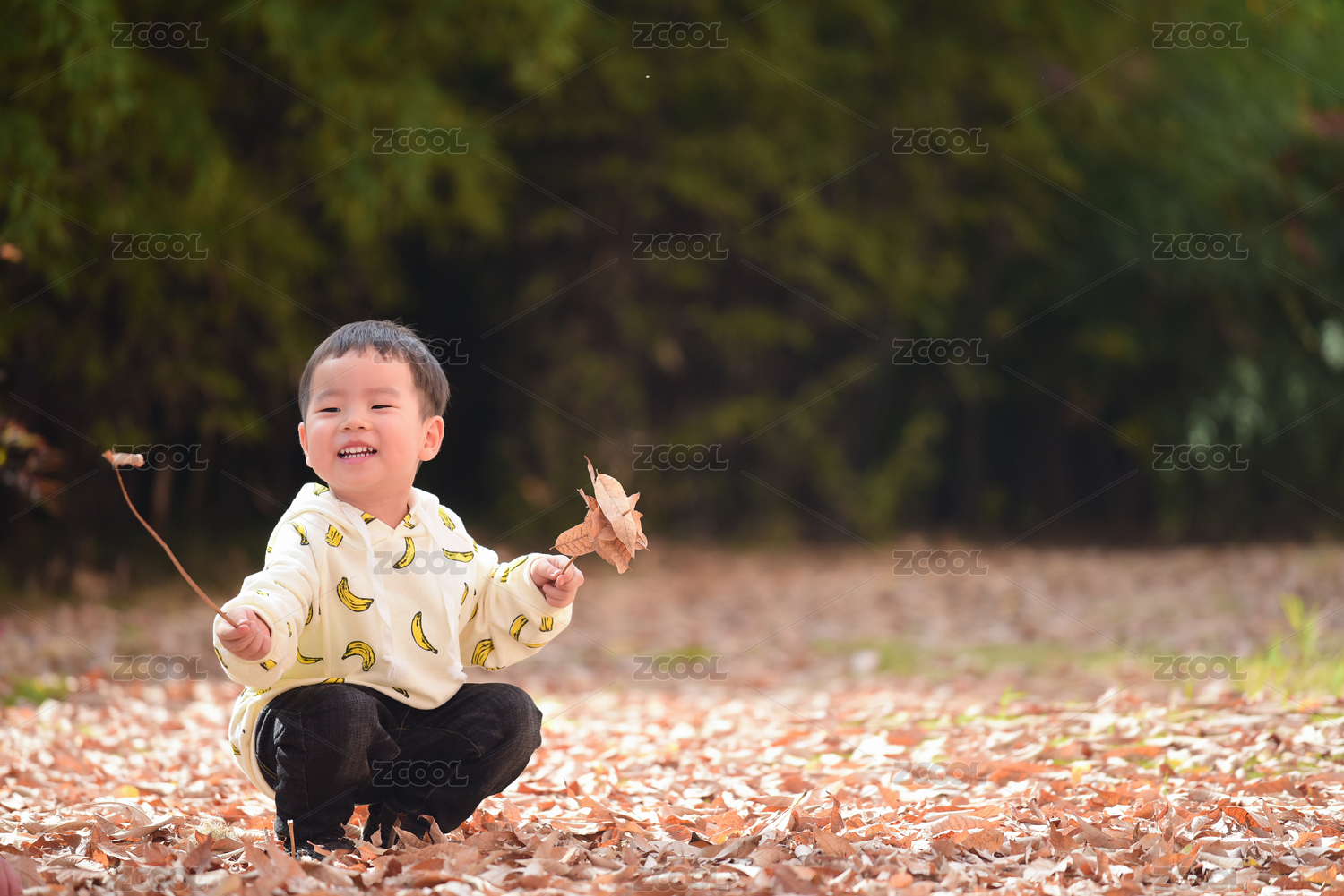 蹲在落满树叶的草地上拿着树枝玩耍的小男孩