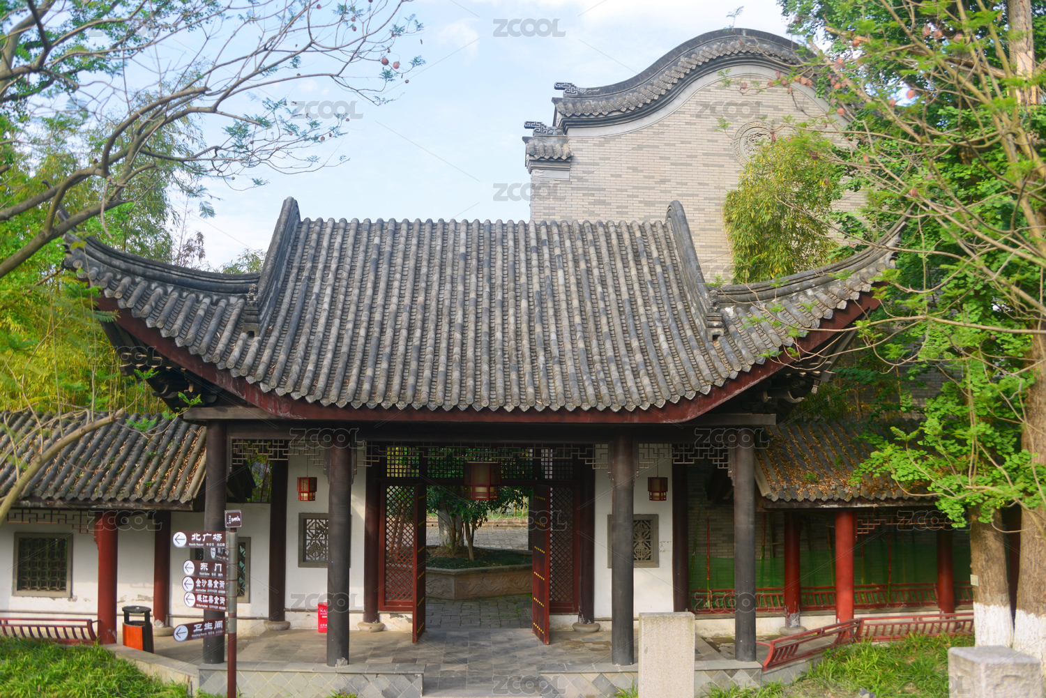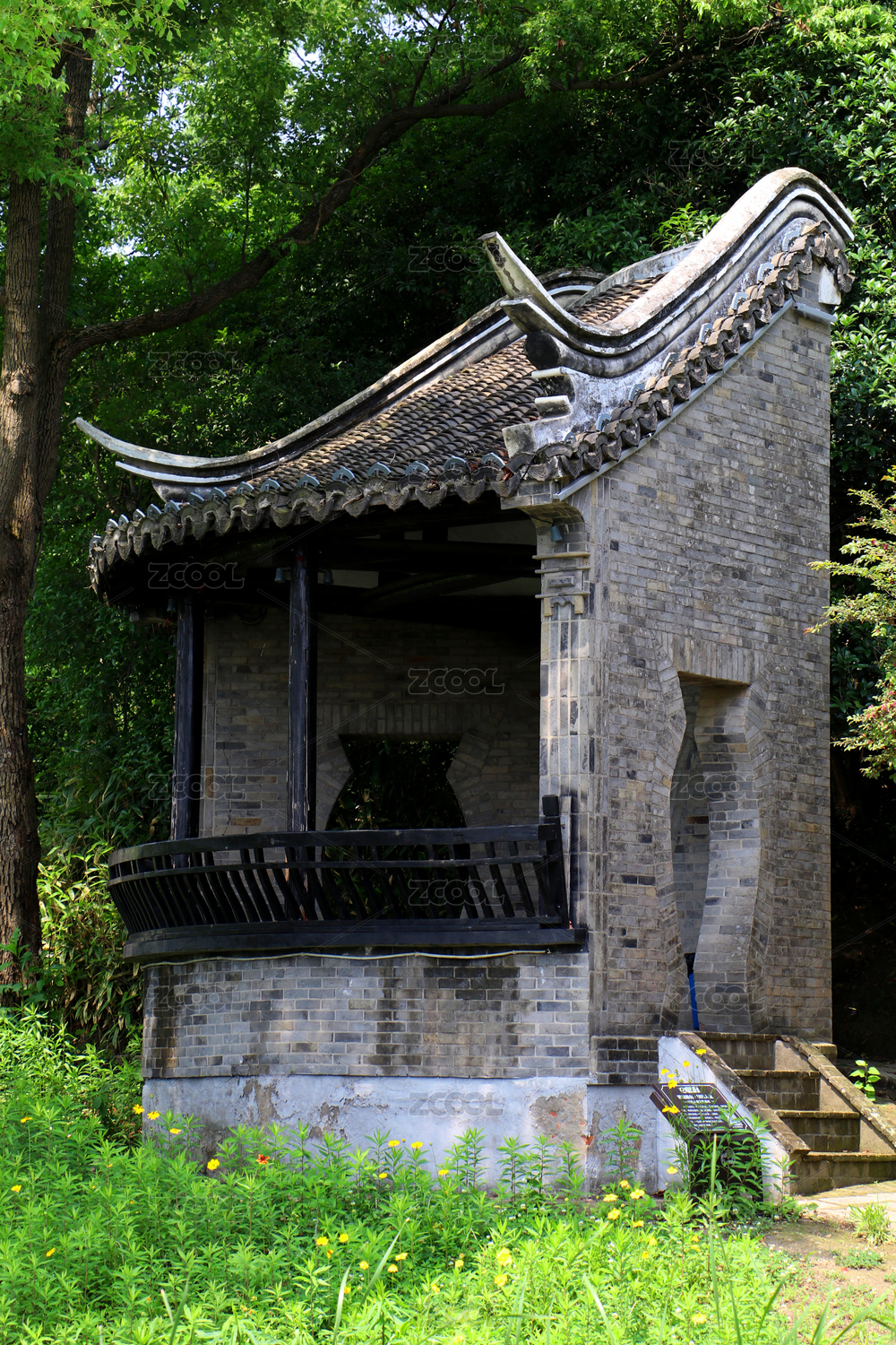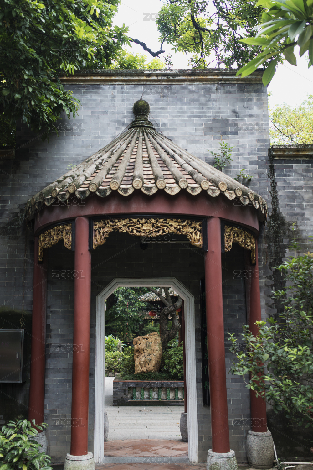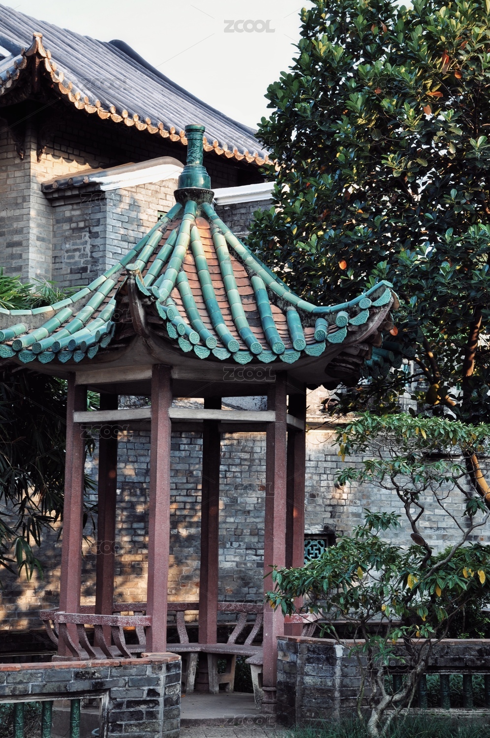 灰砖半亭碧树环