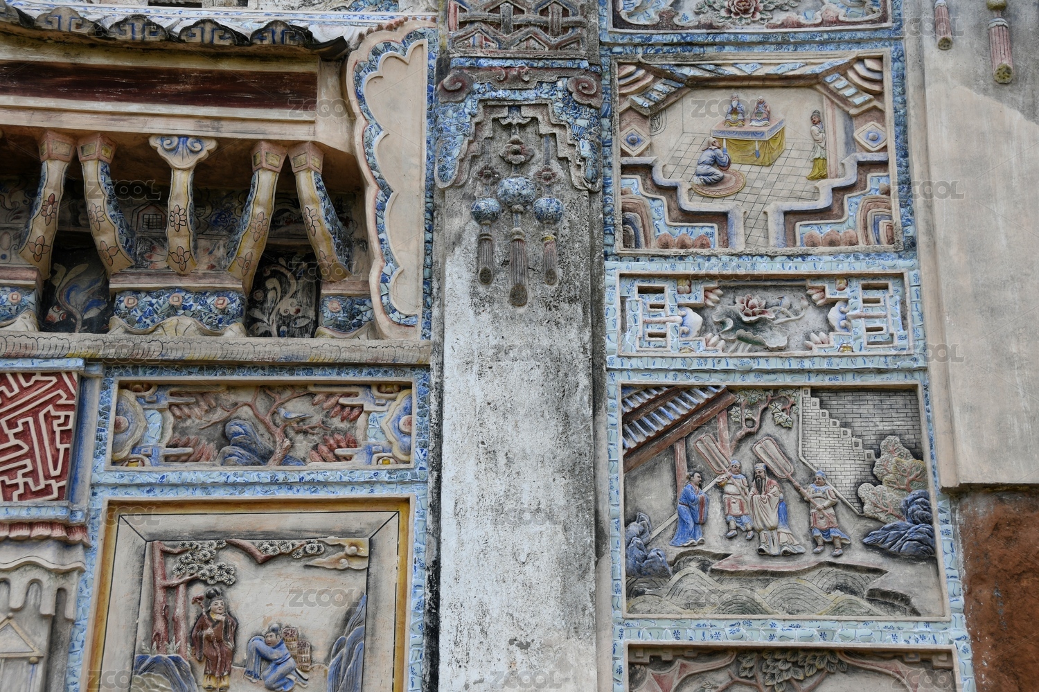 广东广州番禺余荫山房古建筑上的彩绘雕塑