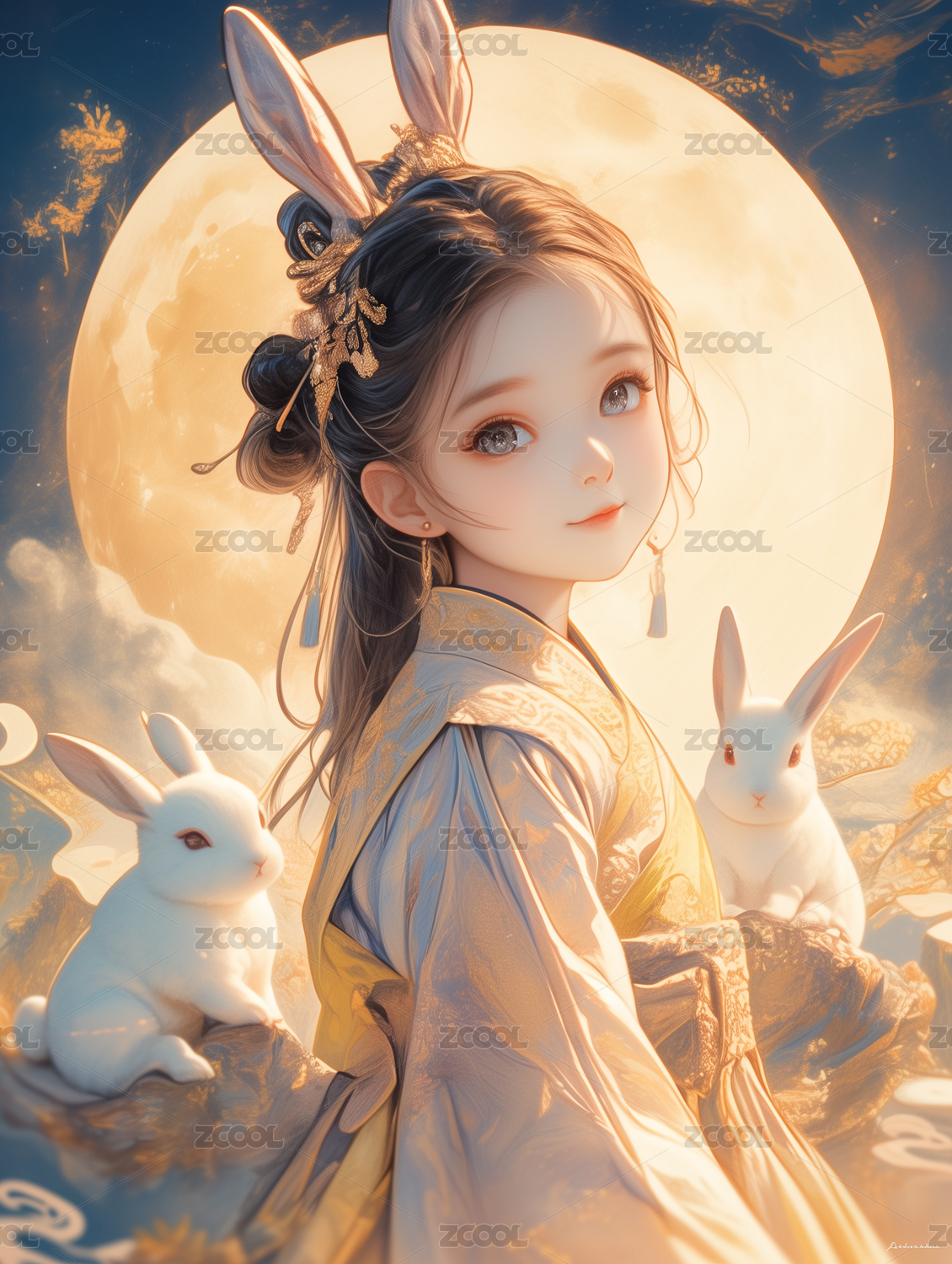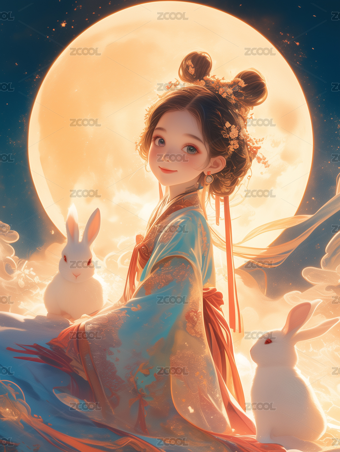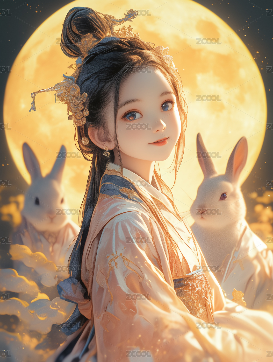 穿汉服的女孩和两只兔子背景是一轮圆月