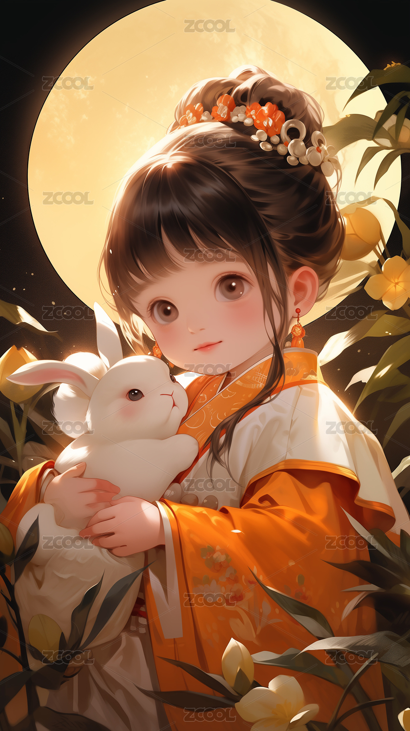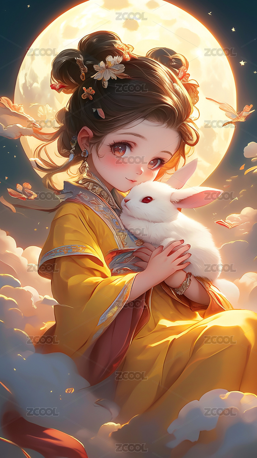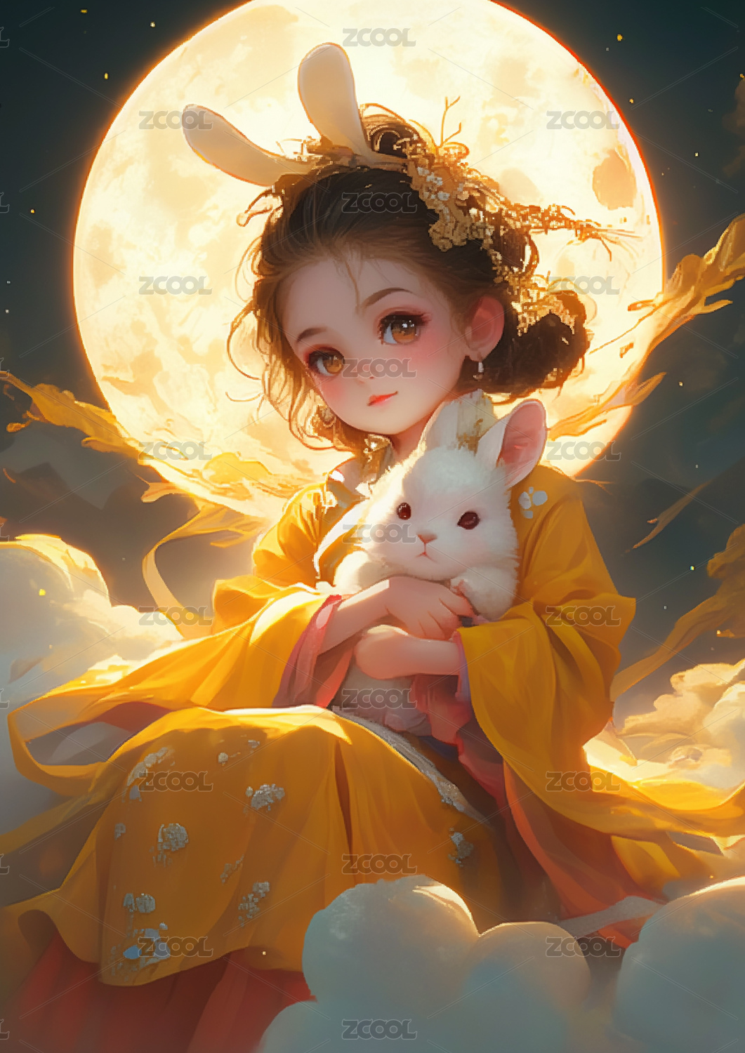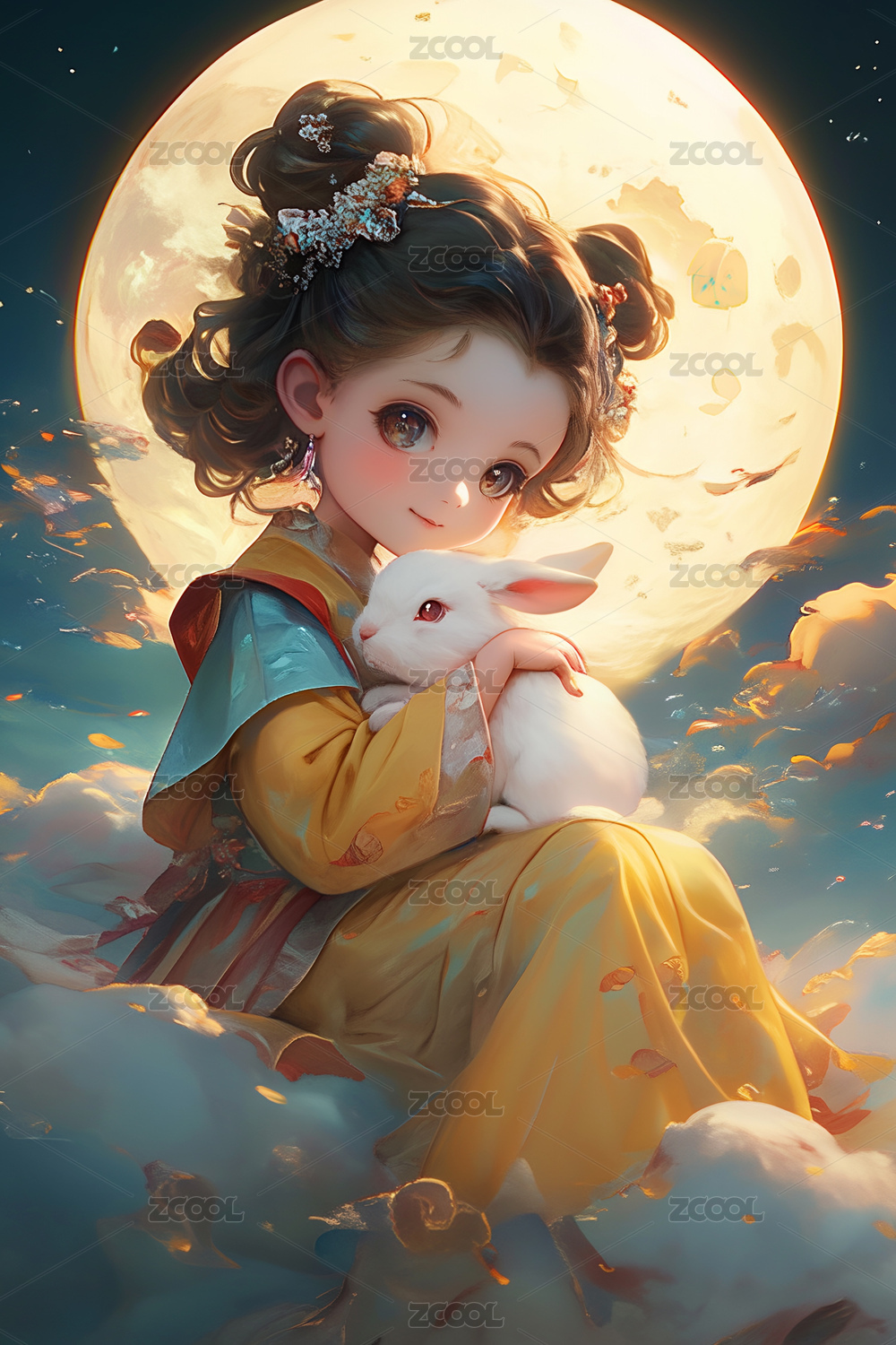 月亮上可爱的小嫦娥抱着兔子
