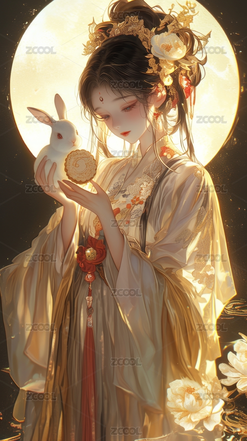 中秋节满月背景下的嫦娥与玉兔