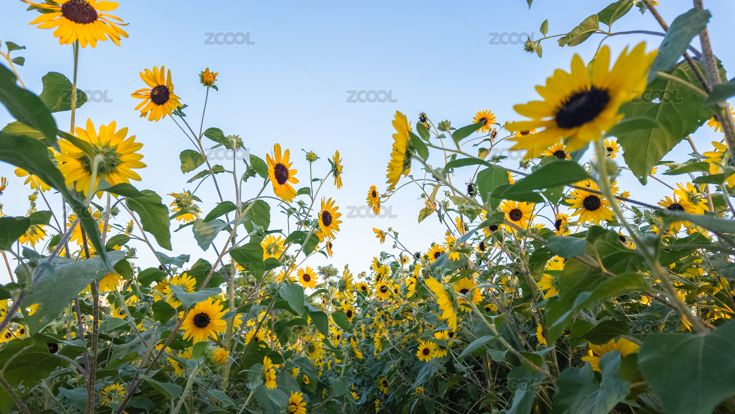 晴天下的向日葵特写花海低视角仰视图