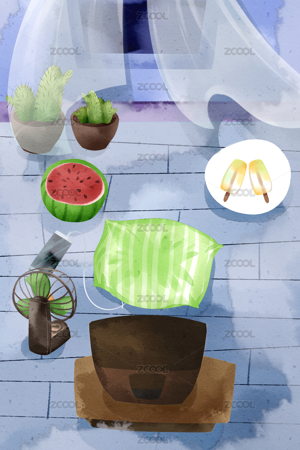 小清新水彩风格室内夏天插画