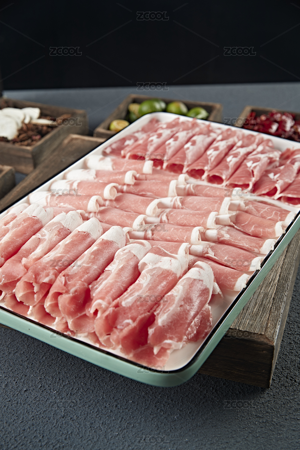 干冰缭绕的背景上摆放的牛羊肉卷双拼