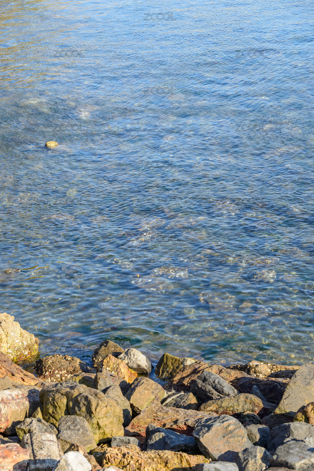 夏天的一片蓝色的清澈海水和石头