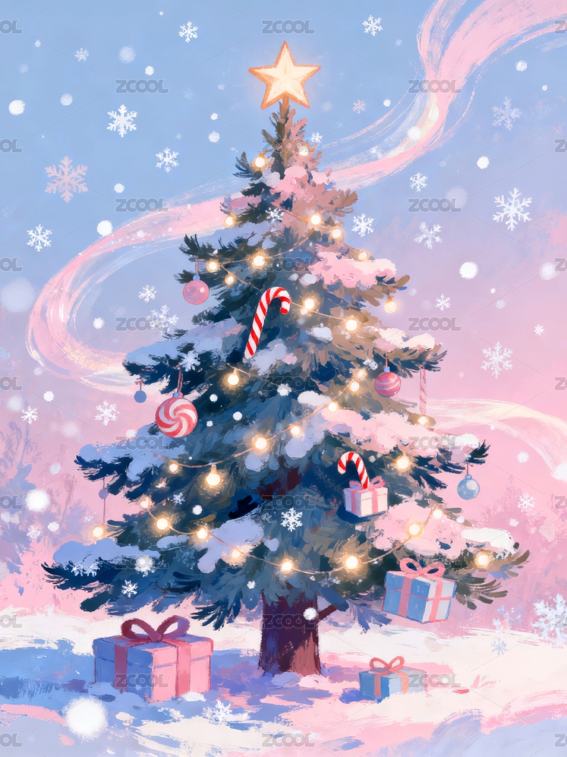 插画,简约,DXCZ202402,圣诞树,装饰品,灯饰,星星,彩带,冬季,芳香