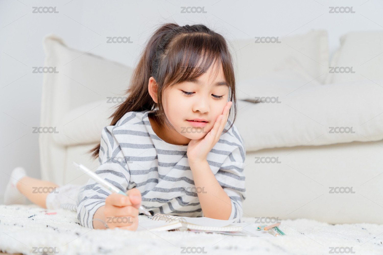 趴在地毯上写字的亚洲小女孩