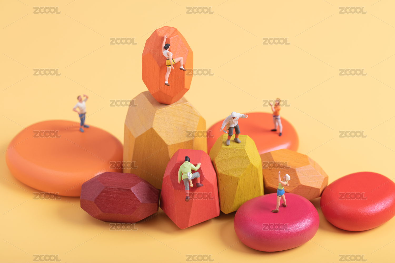 微缩创意彩色堆叠的糖果与玩耍的儿童