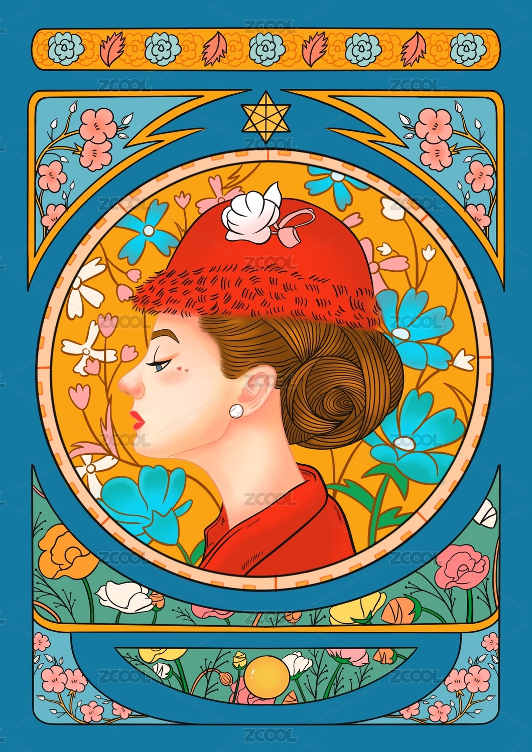 维吾尔族,扁平插画,乐器,扁平,手绘,植物纹,女孩,纹样,花纹,人物