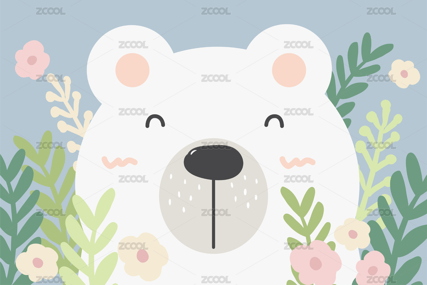 春天,鲜花,治愈,清新,绿色,北极熊,平面,海报,背景,插画