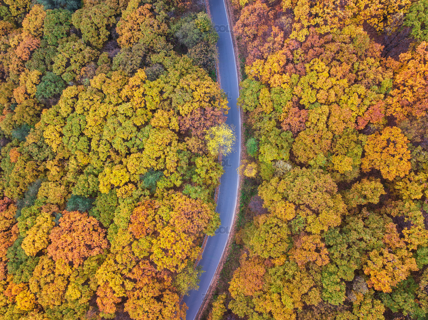 俯瞰东北秋天五彩缤纷森林弯沿公路