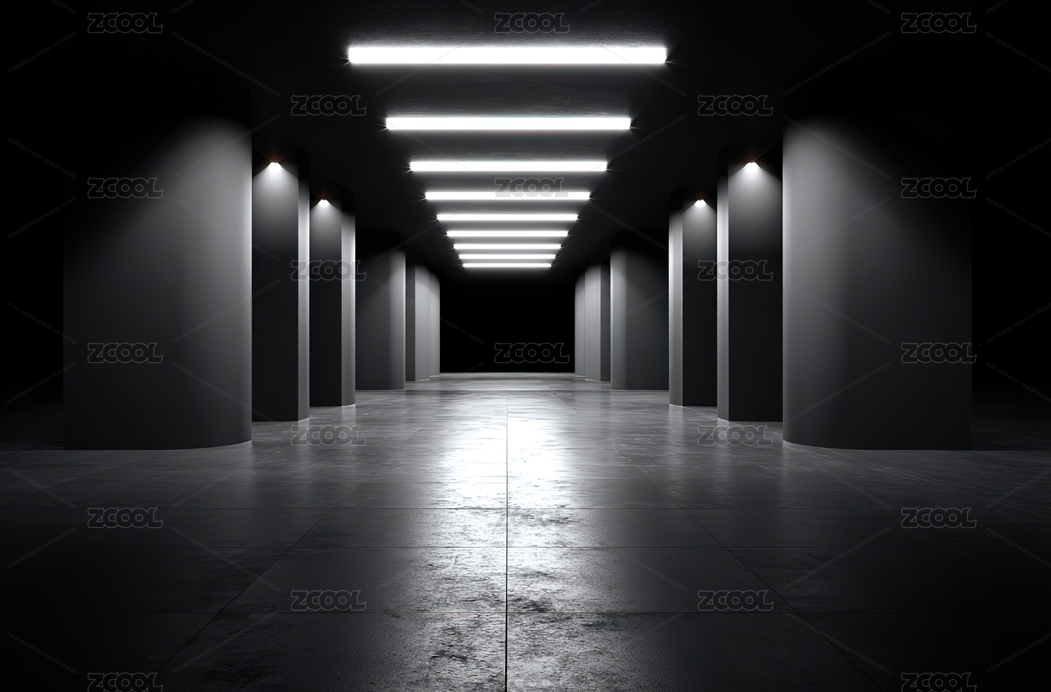 黑暗走廊中的荧光灯照明