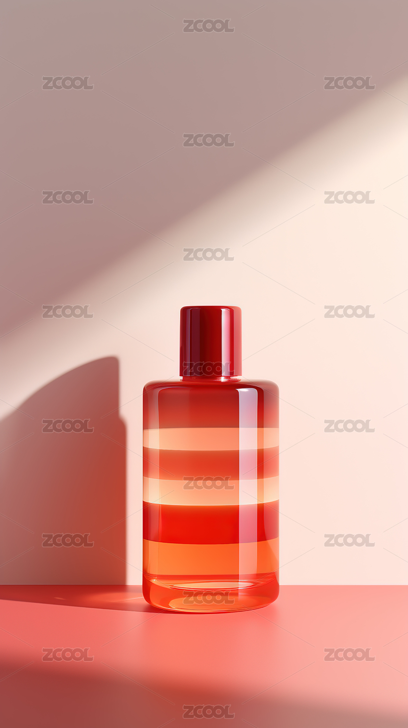 红色条纹香水瓶放在粉色桌面上