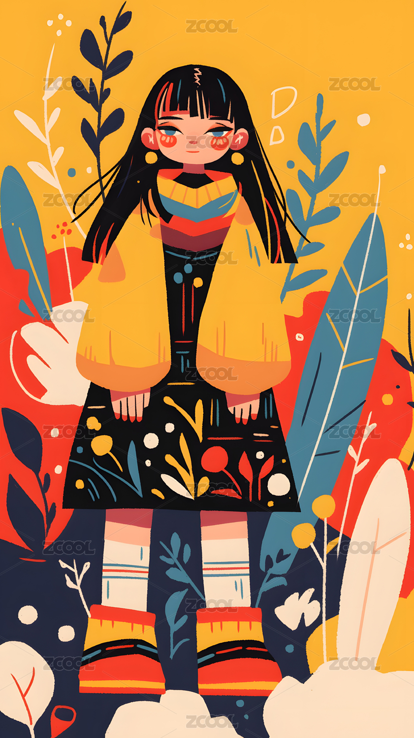 扁平风唯美插画 冬天女孩再雪景中搓手取暖
